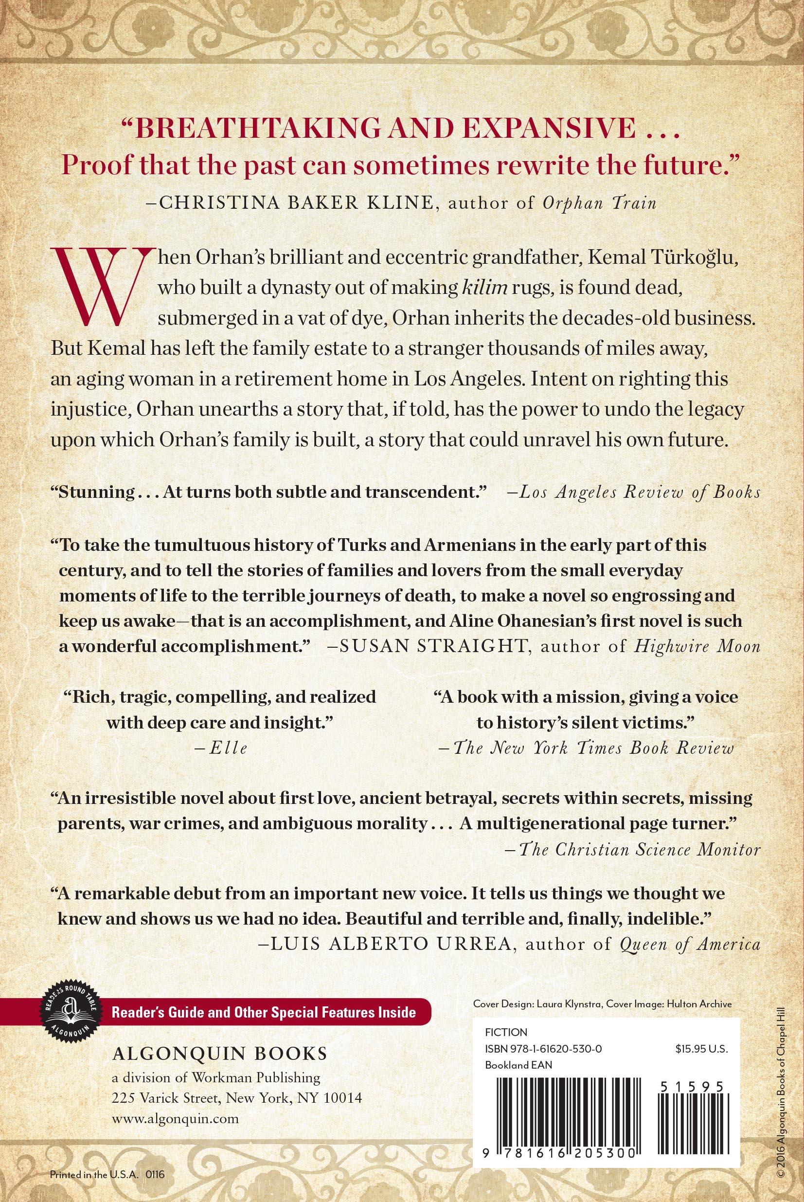When Orhan’s brilliant and eccentric grandfather, Kemal Türkoglu, who built a dynasty out of making kilim rugs, is found dead, submerged in a vat of dye, Orhan inherits the decades-old business. But Kemal has left the family estate to a stranger thousands of miles away, an aging woman in a retirement home in Los Angeles. Intent on righting this injustice, Orhan unearths a story that, if told, has the power to undo the legacy upon which Orhan’s family is built, a story that could unravel his own future.