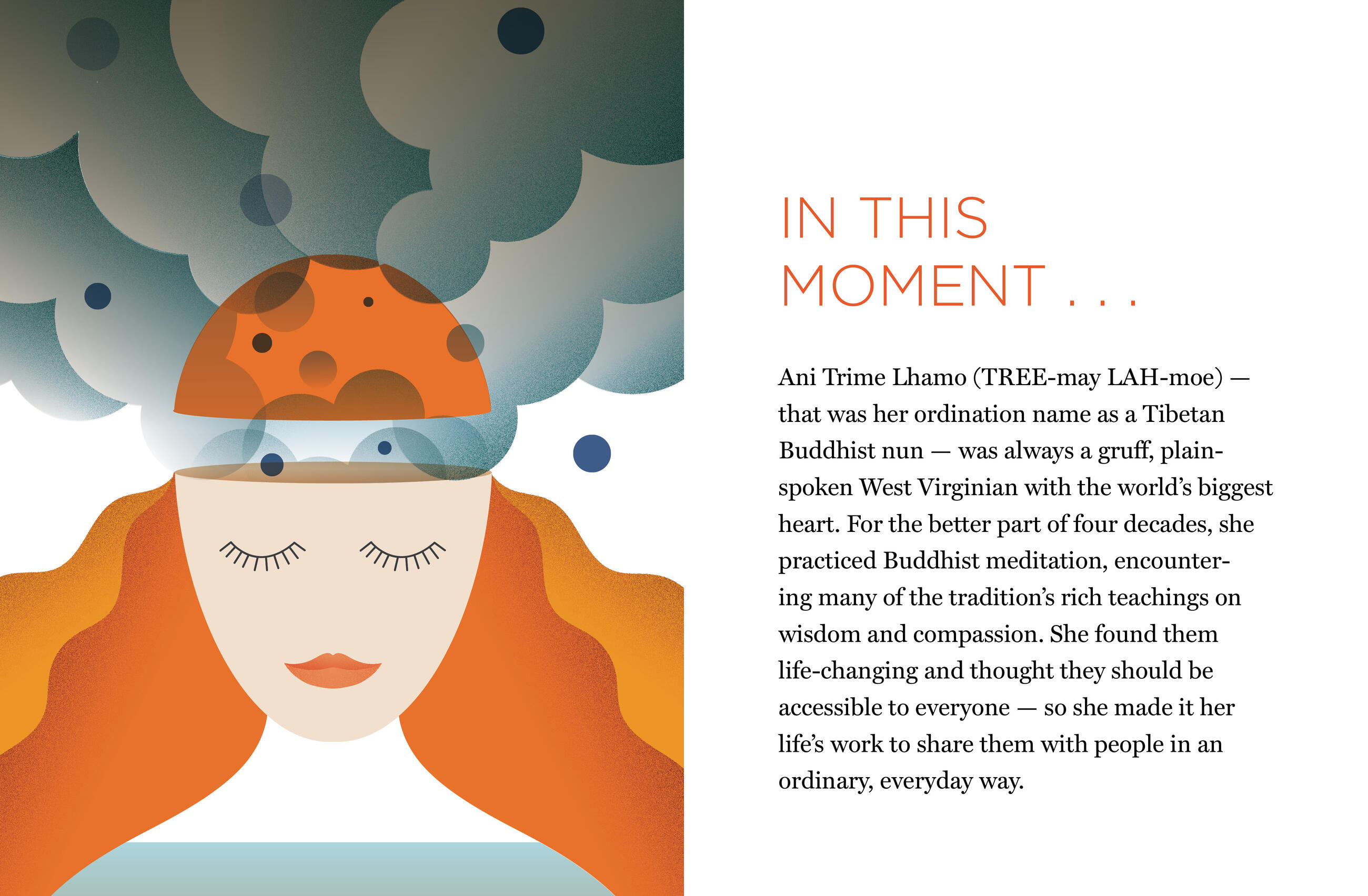 “Ani Trime was an excellent teacher and a great friend. She taught by example and she was genuine always. With this little book of affirmations, you can see into Trime’s generous and gregarious heart and immerse yourself in the wisdom of her years.” — James Kullander, program coordinator of Pema Chödrön’s retreats at the Omega Institute