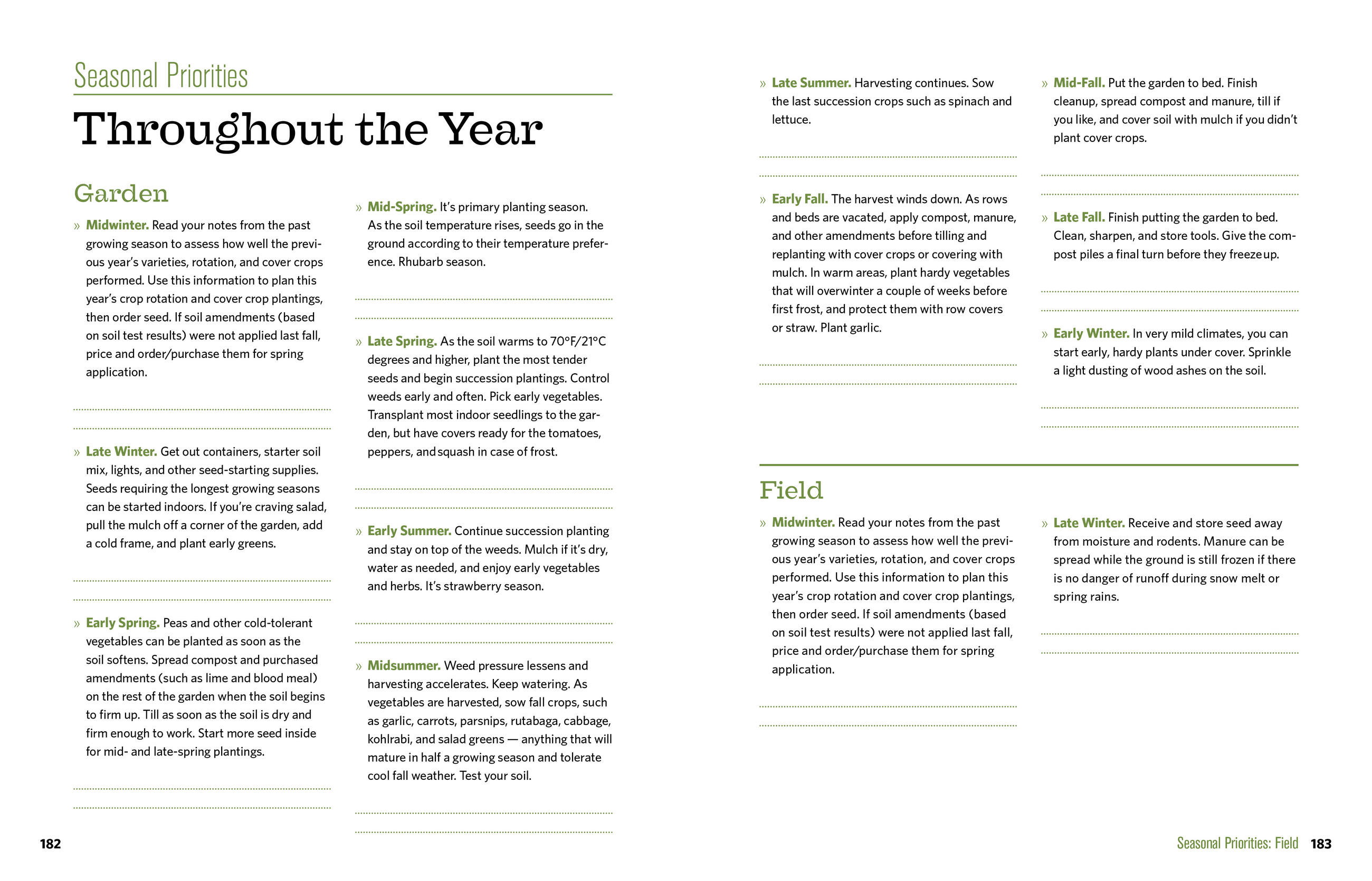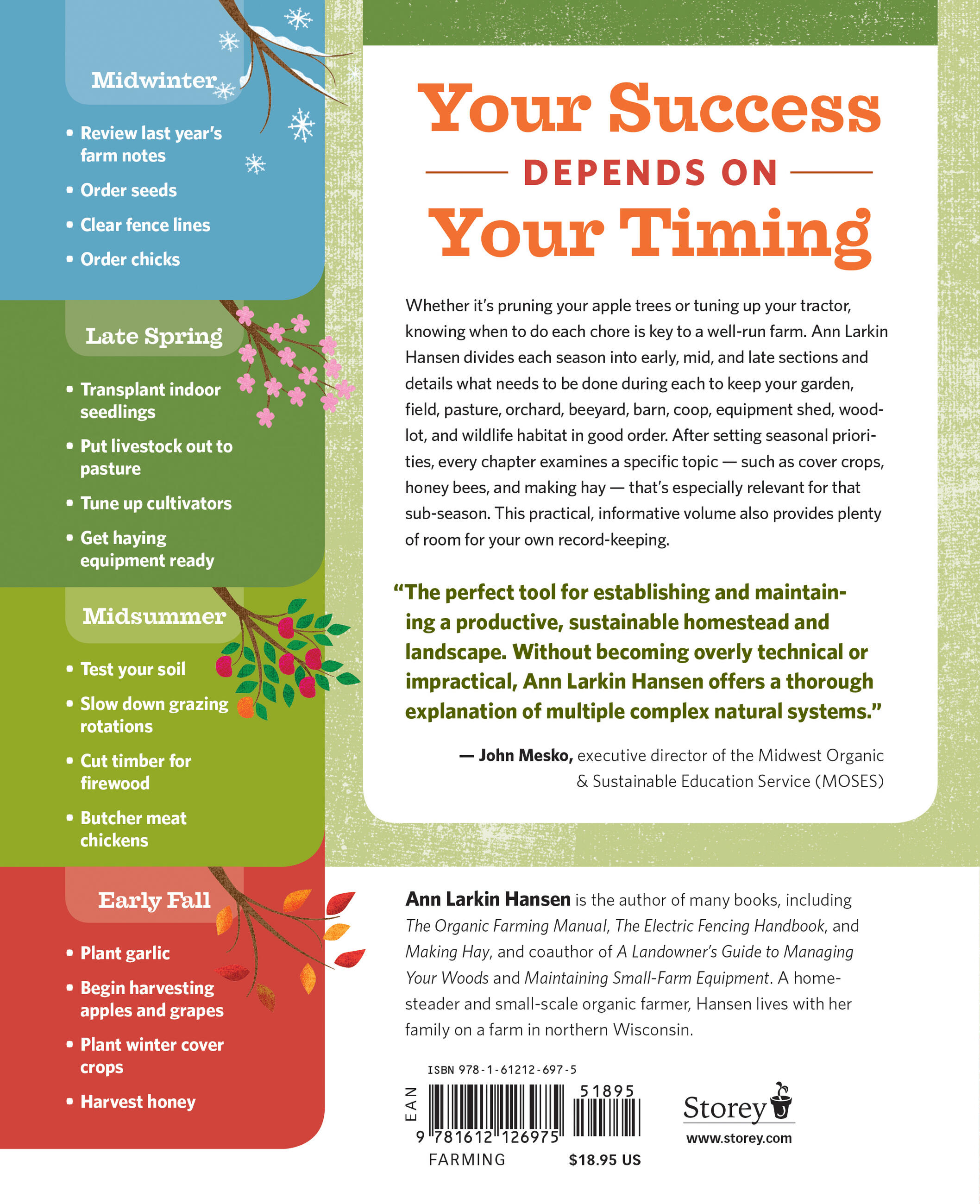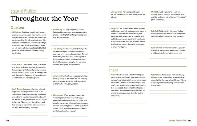 Author Ann Larkin Hansen sets the priorities for each area of the farm, including the barn, garden, orchard, field, pasture, and woodlot. For every critical turn of the year (12 in all), Hansen provides an at-a-glance to-do list along with tips and a more in-depth discussion of key topics for the season. Easy-reference charts, checklists, and record-keeping sections help you keep track of it all.