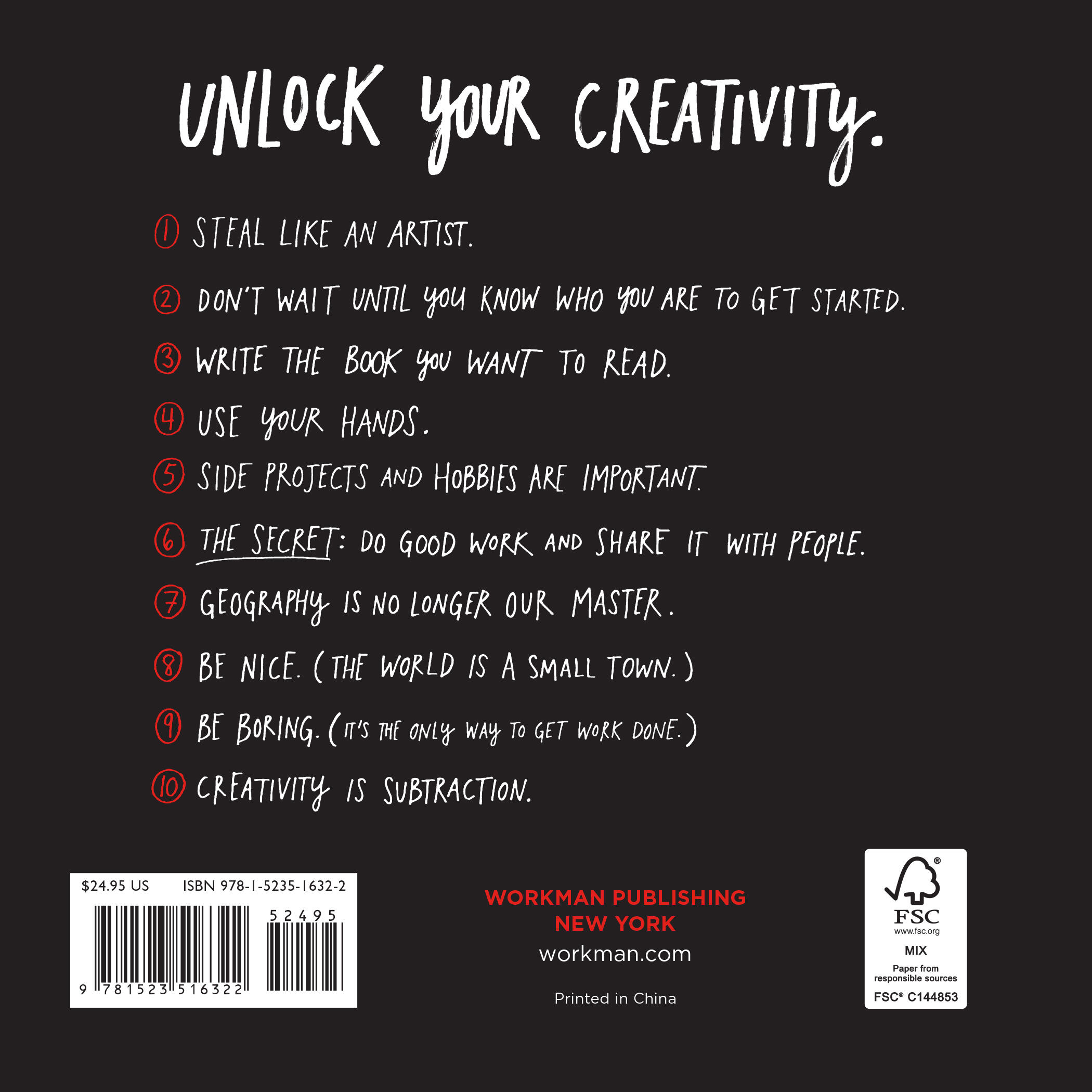 Ten years after its initial publication, the message of Steal Like an Artist remains powerful: embrace influence, follow interests wherever they take us, forget old clichés like writing about what you know—instead, write the book that you want to read, make the movie you want to watch. And above all, find the space you need to be wild and daring in your imagination and your work.