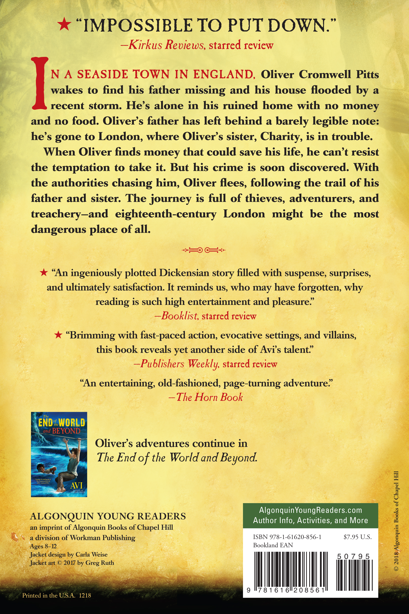 B>School Library Journal“With dry wit and a strong Dickensian flavor, this first installment in Avi’s Oliver Cromwell Pitts saga has an 18th-century British boy finding misfortune everywhere he turns . . . Every cliffhanger-ending chapter will leave readers on the edge of their seats, wondering how Oliver will manage to survive his latest dilemma. Brimming with fast-paced action, evocative settings, and villains, this book reveals yet another side of Avi’s talent.”
