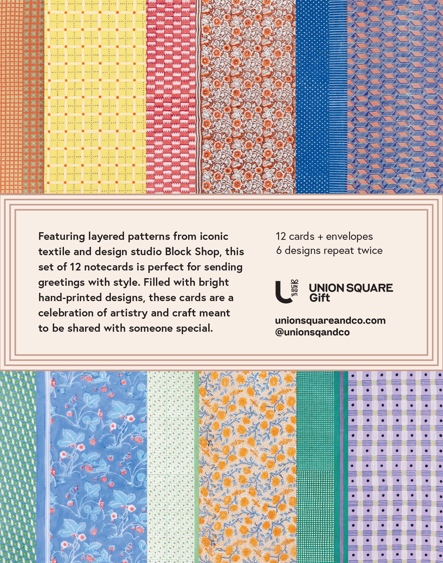 Featuring iconic textile prints from design studio Block Shop, this set of 12 notecards is perfect for sending greetings with style. Each 4 5/8 x 6 1/8 card features a richly patterned Block Shop print with a matching envelope, all housed in an elegant four-color magnetic keepsake box that can be used for treasures long after the last notecard is sent. Showcasing the rich and graphic beauty of hand-printed textile designs, these cards are a celebration of artistry and craft meant to be shared with someone special.