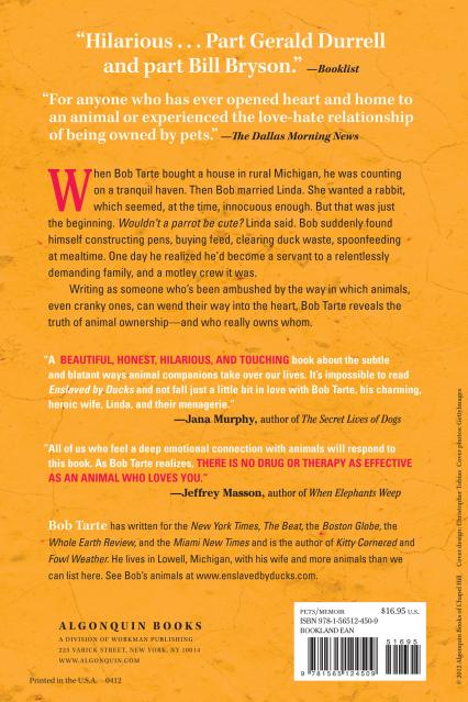 When Bob Tarte bought a house in rural Michigan, he was counting on a tranquil haven. Then Bob married Linda. She wanted a rabbit, which seemed innocuous enough until the bunny chewed through their electrical wiring. And that was just the beginning. Before long, Bob found himself constructing cages, buying feed, clearing duck waste, and spoon-feeding a menagerie of furry and feathery residents. His life of quiet serenity vanished, and he unwittingly became a servant to a relentlessly demanding family. “They dumbfounded him, controlled and teased him, took their share of his flesh, stole his heart” (Kirkus Reviews).