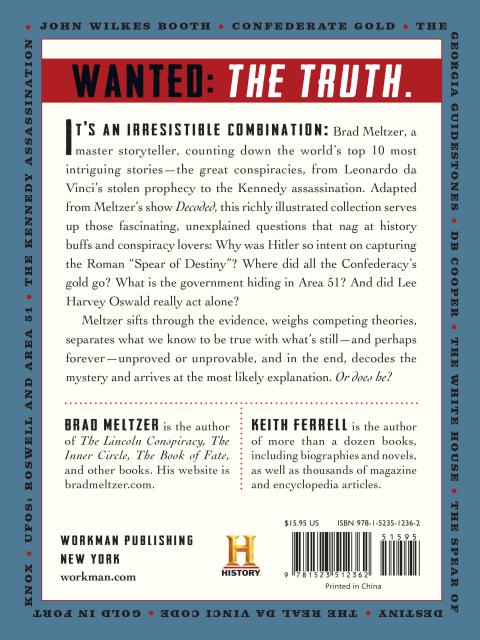 Wanted: the truth. In a riveting collection, Brad Meltzer guides us through the 10 greatest conspiracies of all time, from Leonardo da Vinci’s stolen prophecy to the Kennedy assassination. This richly illustrated book serves up those fascinating, unexplained questions that nag at history buffs and conspiracy lovers: Why was Hitler so intent on capturing the Roman “Spear of Destiny?” Where did all the Confederacy’s gold go? What is the government hiding in Area 51? And did Lee Harvey Oswald really act alone?
