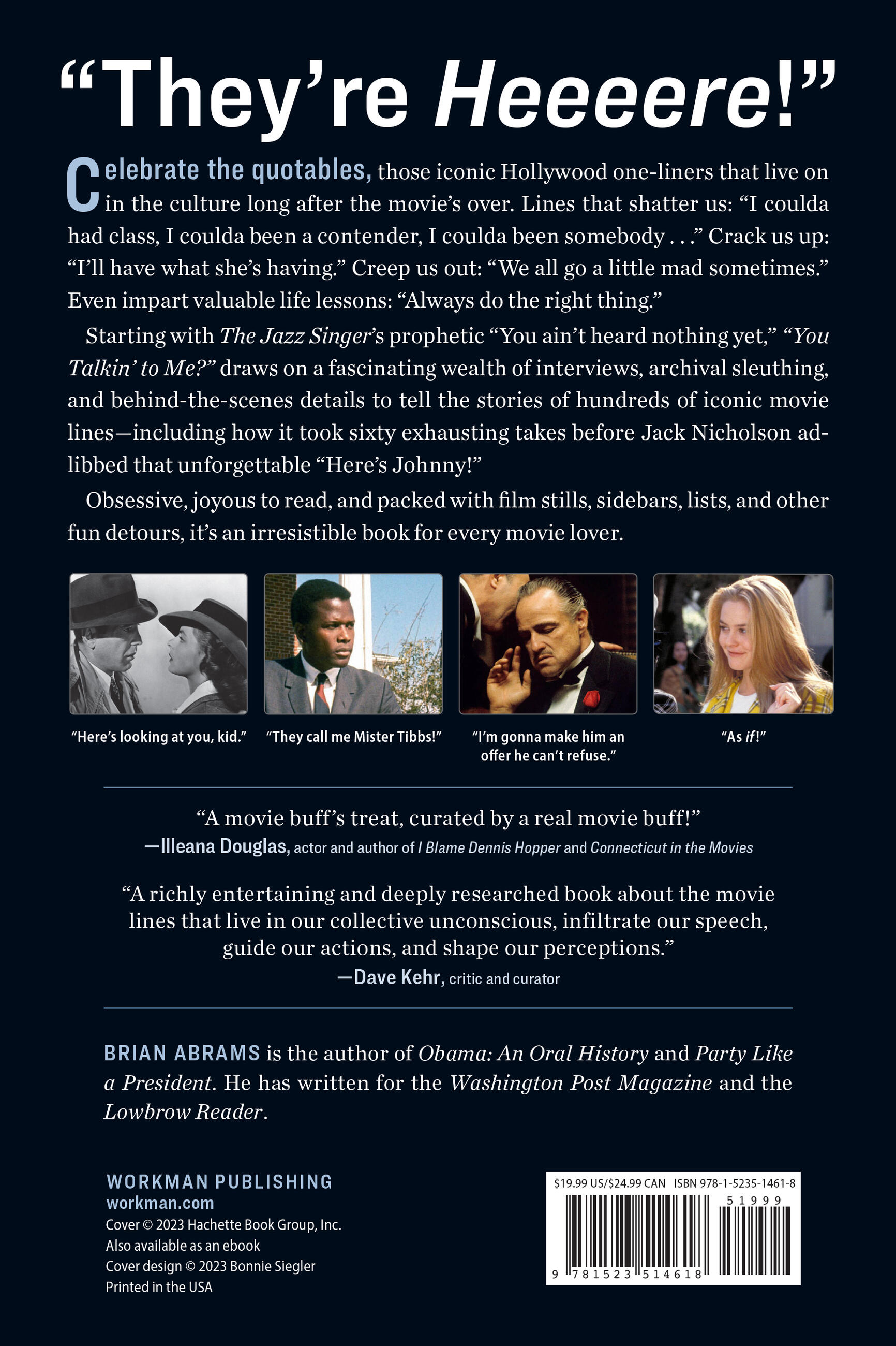 “You Talkin’ to Me?” is a fun, fascinating, and exhaustively reported look at all the iconic Hollywood movie quotes we know and love, from Casablanca to Dirty Harry and The Godfather to Mean Girls. Drawing on interviews, archival sleuthing, and behind-the-scenes details, the book examines the origins and deeper meanings of hundreds of film lines: how they’ve impacted, shaped, and reverberated through the culture, defined eras in Hollywood, and become cemented in the modern lexicon. Packed with film stills, sidebars, lists, and other fun detours throughout movie history, the book covers all genres and a diverse range of directors, writers, and audiences.Genre: