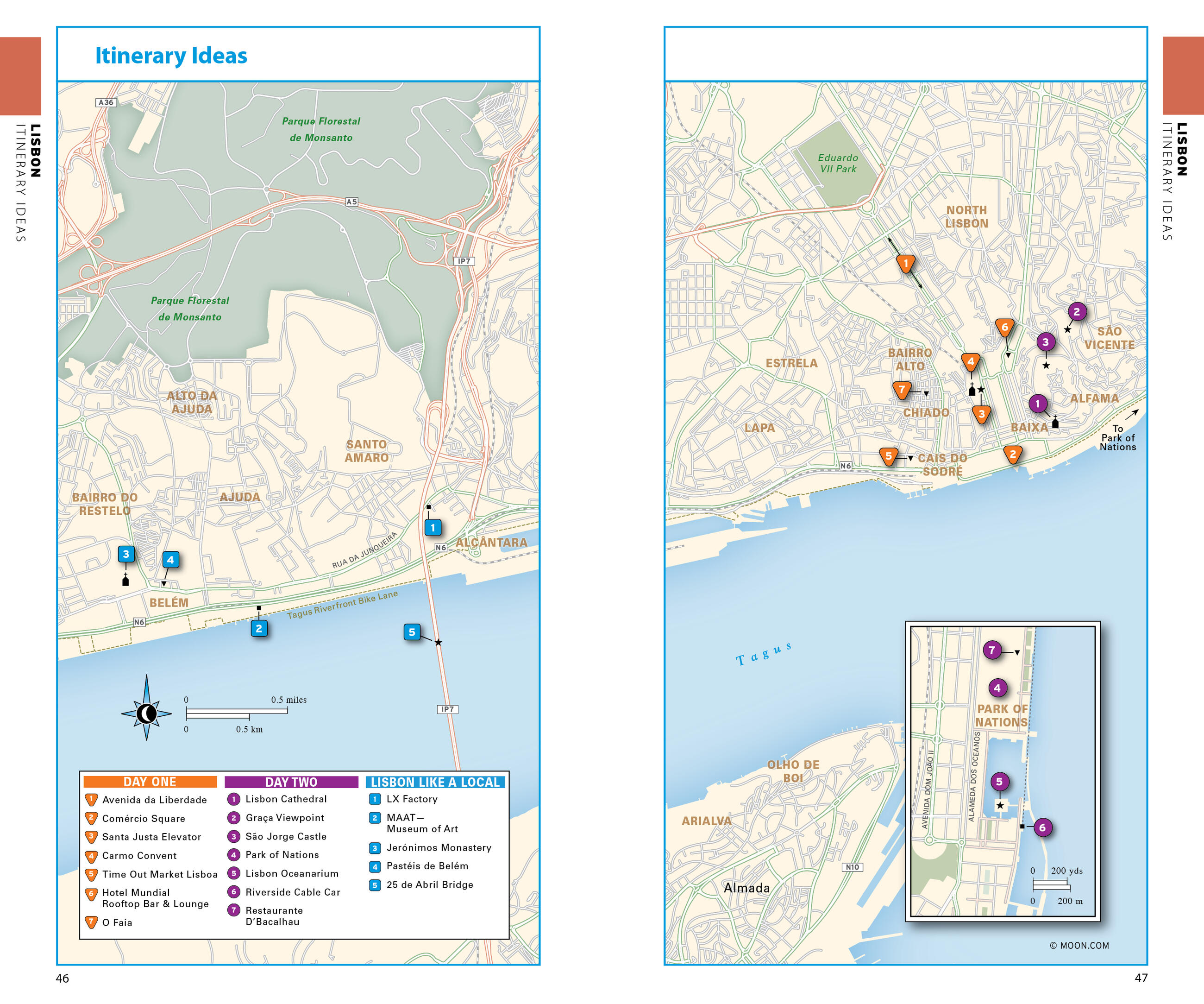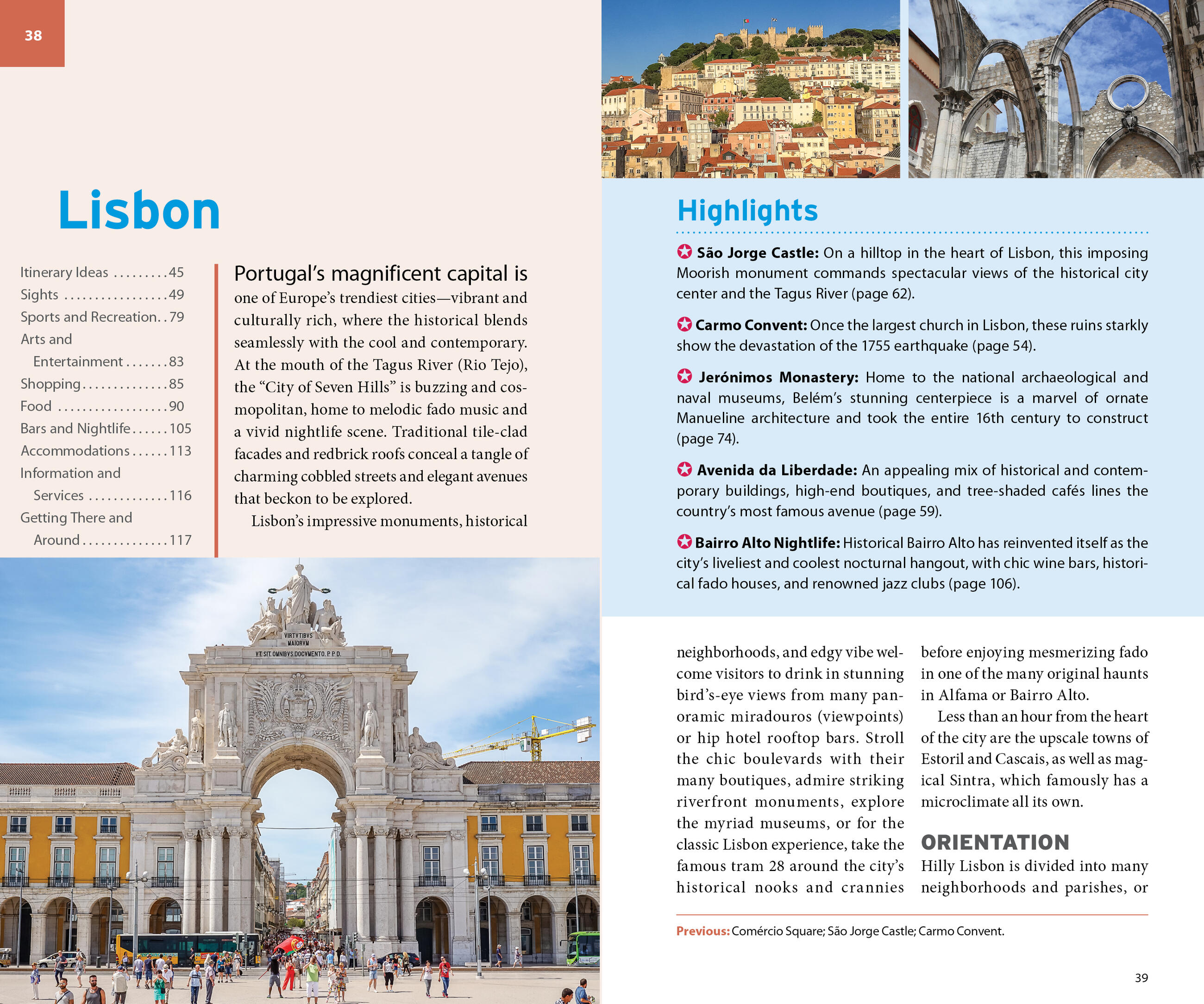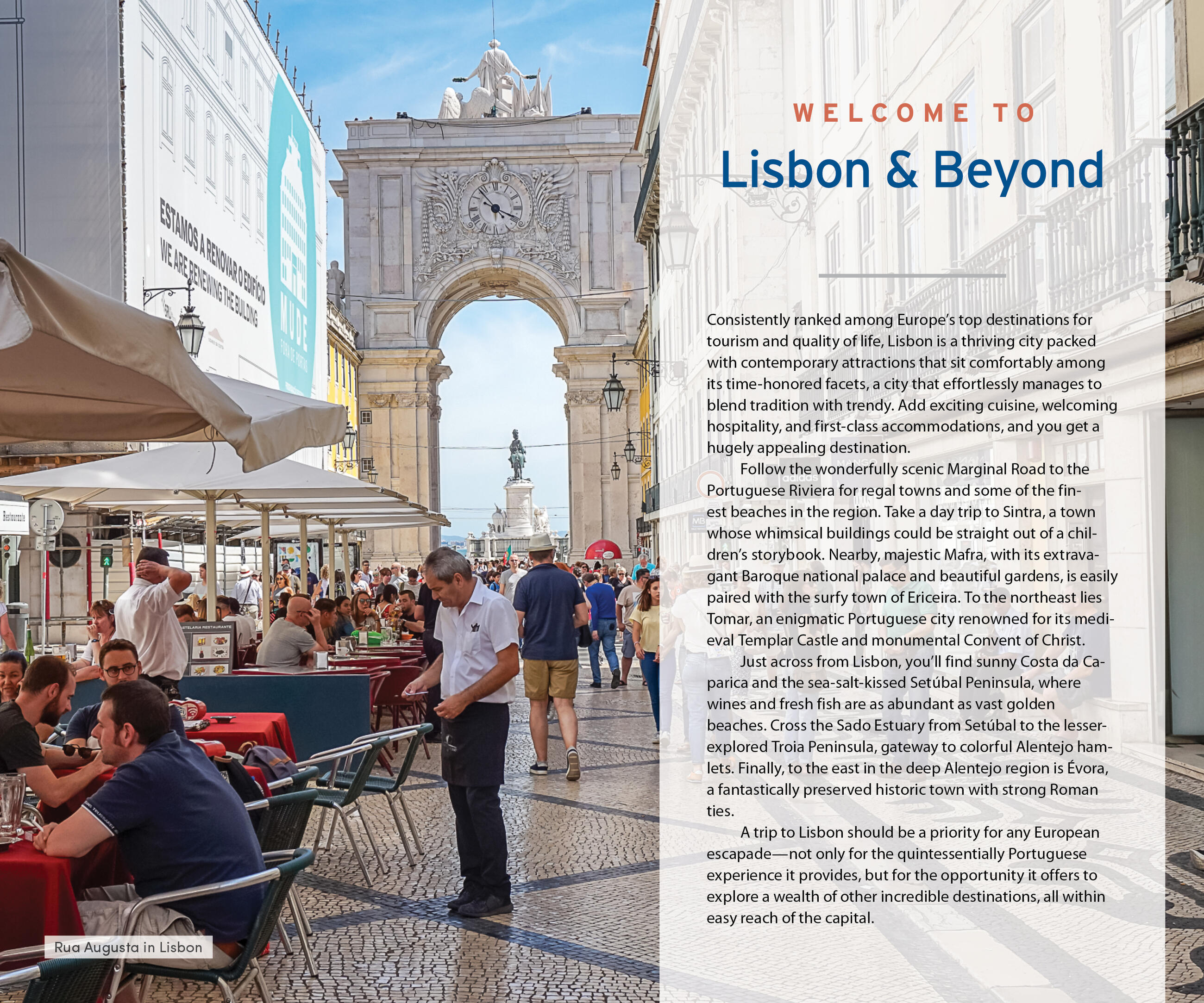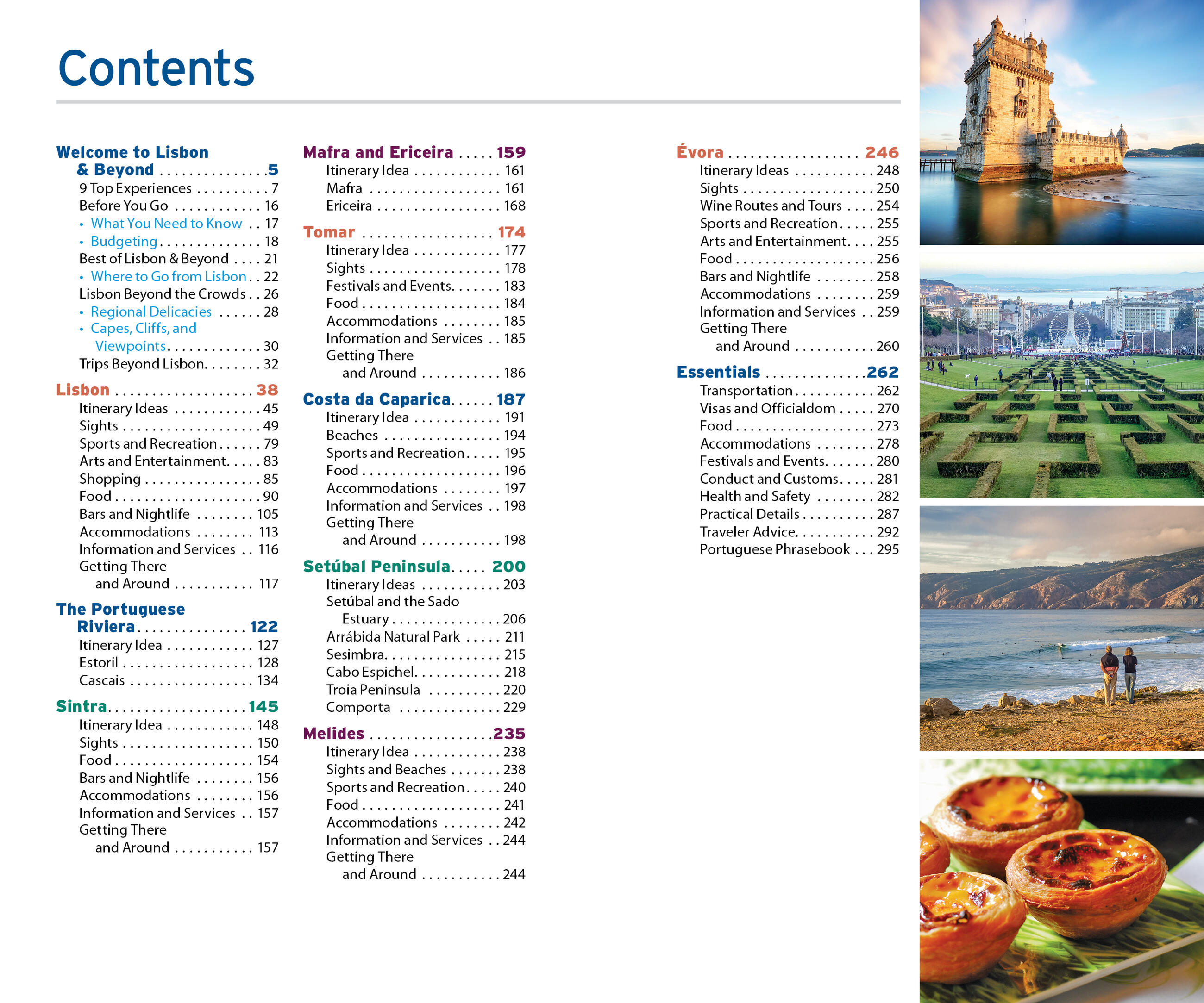 - In-depth coverage of neighborhoods, like Baixa, Chiado, Bairro Alto, and Belém, and nearby regions, including the Setúbal Peninsula, the Portuguese Riviera, and the Costa da Caparica