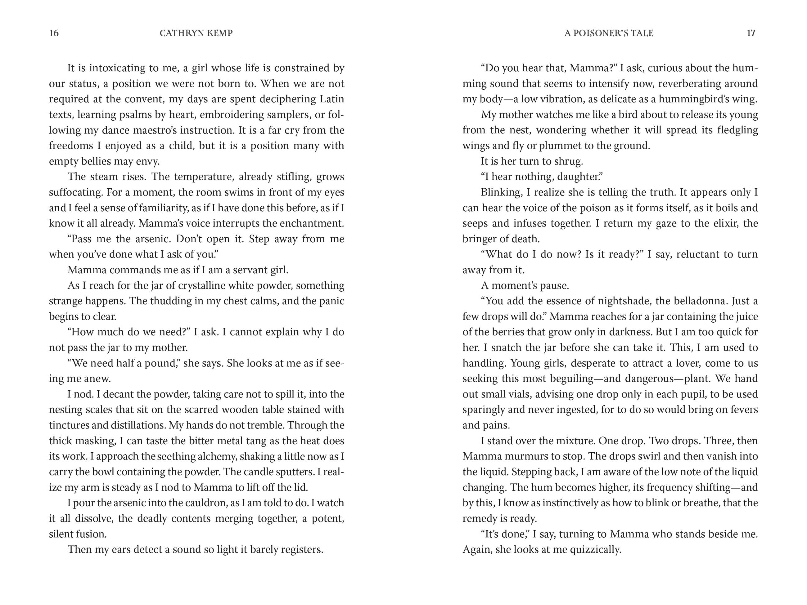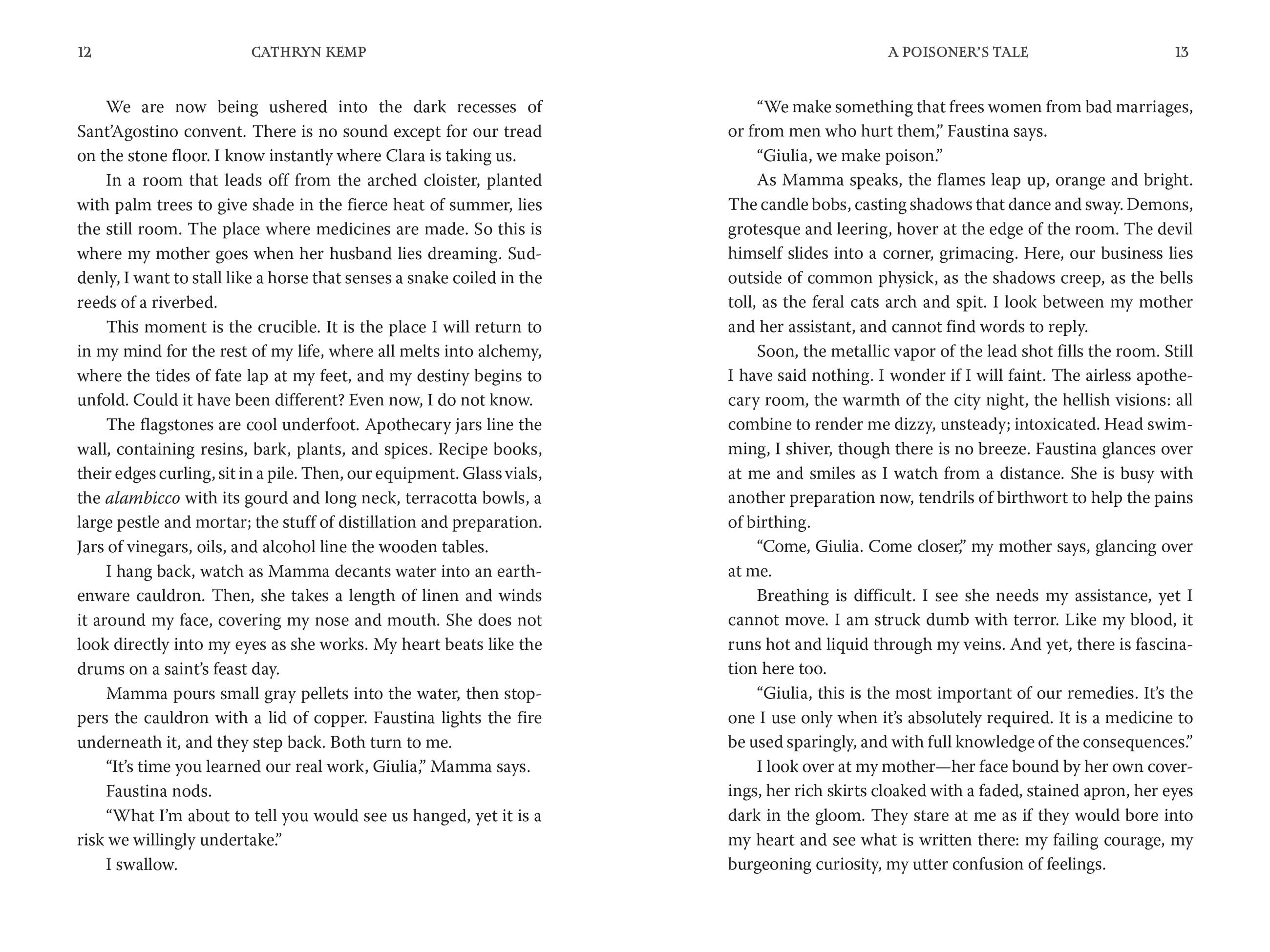 Palermo 1632: Giulia is thirteen when she learns her mother greatest secret: Teofania makes an undetectable, slow-acting, lethal poison—Acqua Tofana—which she uses to free the broken and abused women of Palermo. Now Teofania wants to pass her recipe on to her daughter, and Giulia soon realizes that in a time when women have no voice, justice is sometimes best served in a cup of wine or broth.