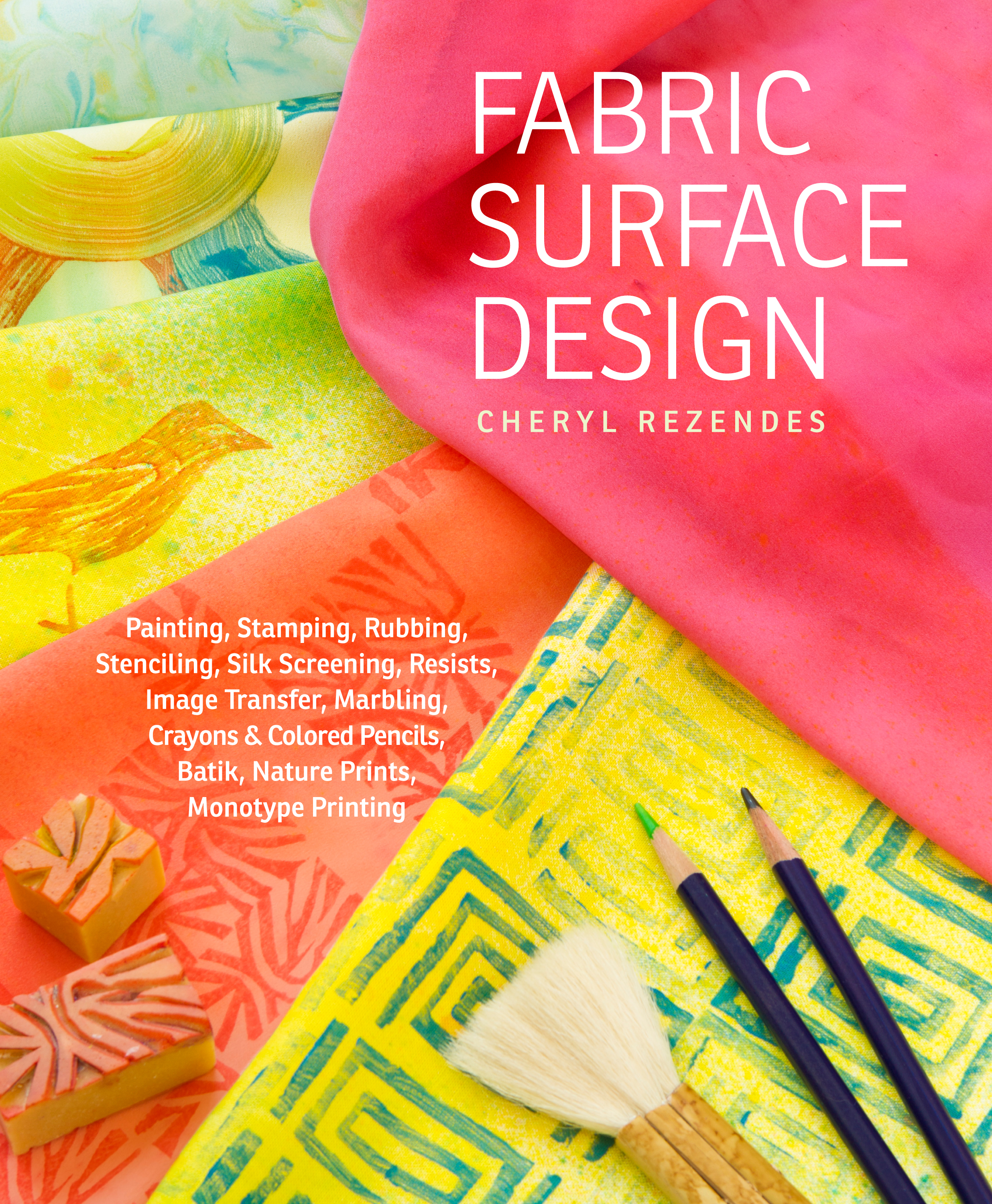 “Rezendes’s handbook of techniques for making fabric one-of-a-kind is for crafters of all skill levels. Novices will see this and be grateful. Those who have just dipped paint to fabric will be bolstered by the assistance. And experienced fabric designers will have some “ah ha” moments as they build upon their knowledge of painting, stamping, resists, image transfer, marbling, batik, and so much more.” — Publishers Weekly