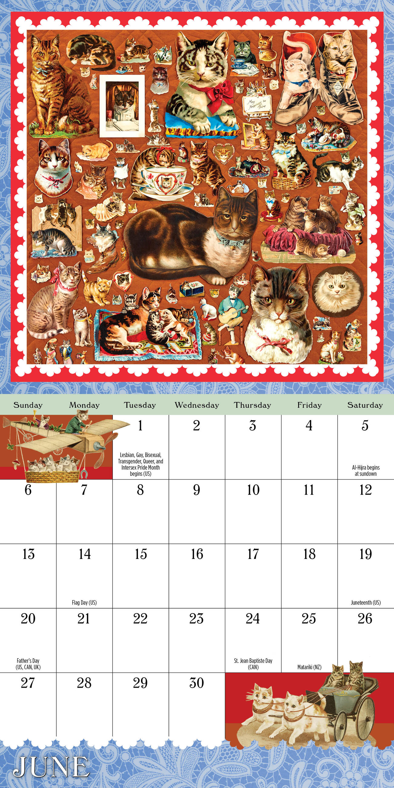 - FELINE FANCIES: Cats are the star of each month’s gorgeous collage: a kitty accompanies a pot of tea in July, a multi-colored trio takes over August, and family of cats enjoy dinnertime chaos in November.