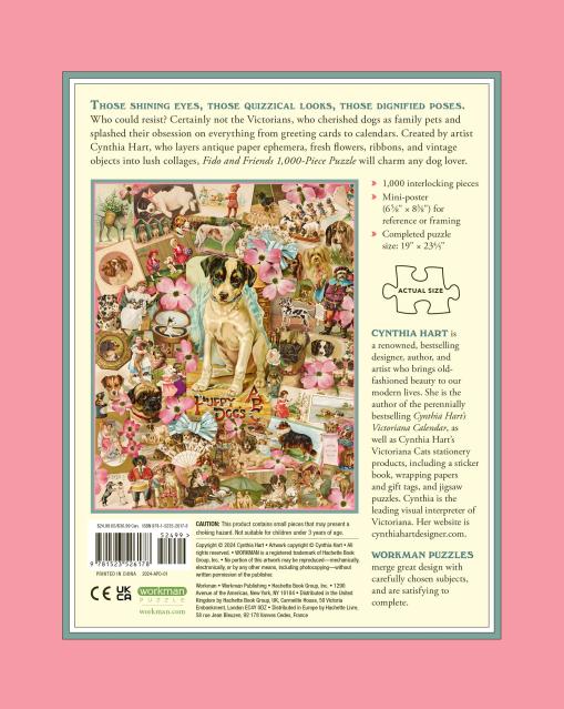 Dogs were celebrated during the Victorian era because they embodied important cultural values of the time: steadfast, loyal, courageous. They became the most popular domestic pets—Dash, a King Charles Spaniel, was considered Queen Victoria’s closest childhood companion—and were pampered just as they are today. Created by artist Cynthia Hart, who layers antique paper ephemera, fresh flowers, ribbons, and vintage objects into lush collages filled with life, color, and energy, this timeless 1,000-piece puzzle celebrates the charming personalities of the dogs that captured hearts everywhere during the 19th century.