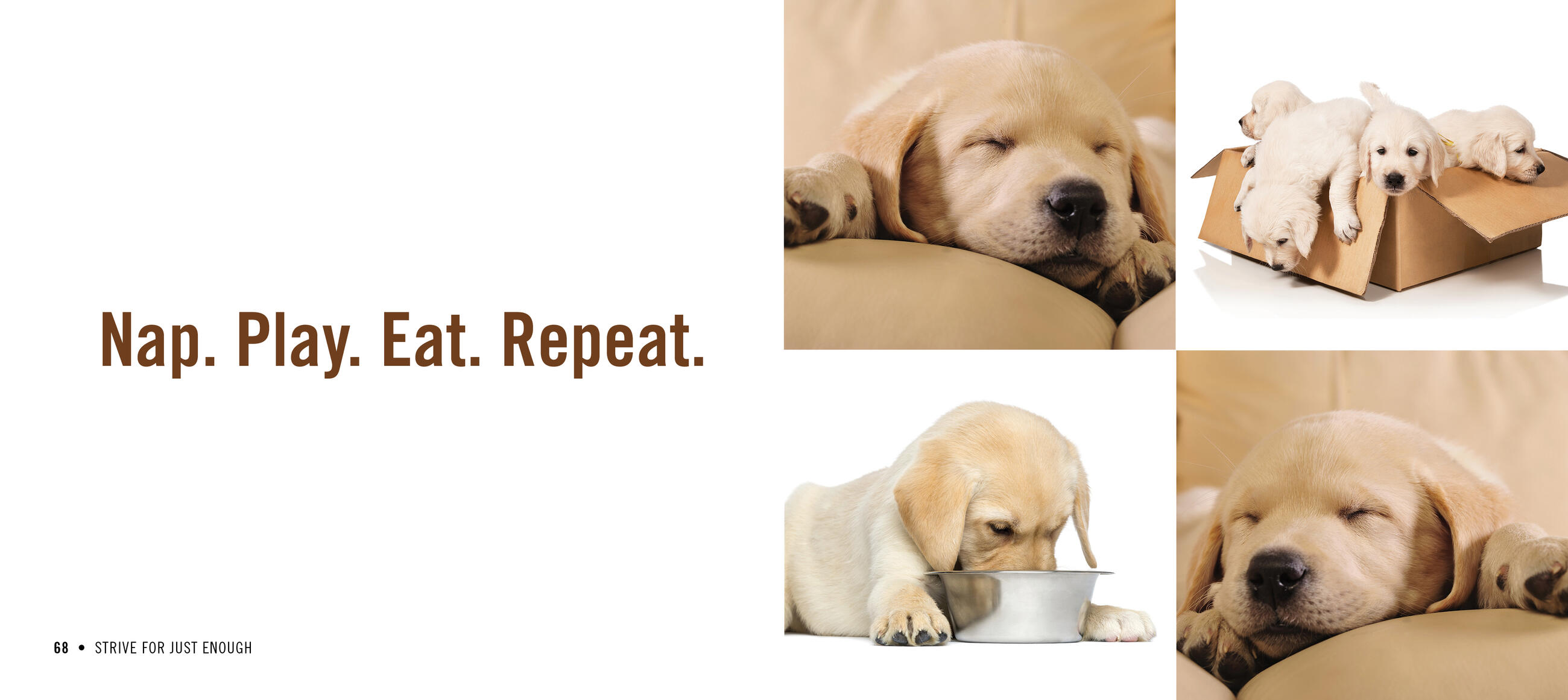 Playful spaniels completely covered with snow—“There’s no such thing as ‘bad’ weather.” Two happy dogs sleeping, one on top of the other— “Sometimes you need a pillow. Sometimes you are the pillow.” The bulldog who’s headfirst in her bowl—“Every meal is THE BEST MEAL EVER.”