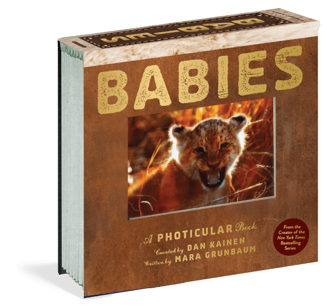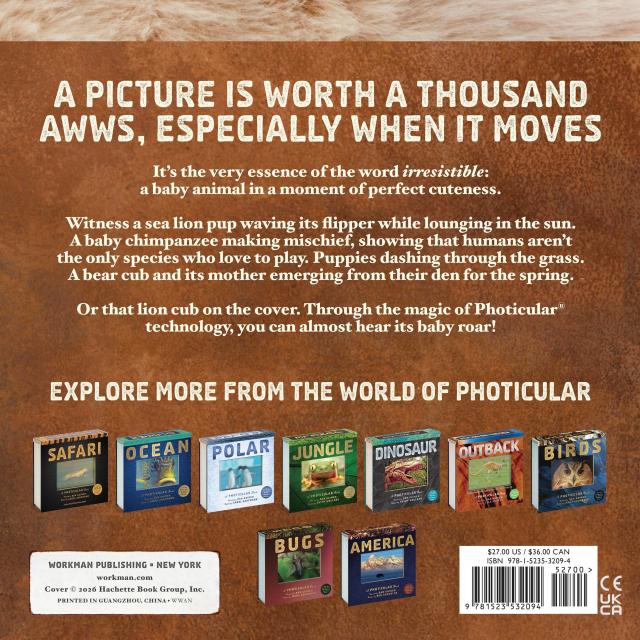 The bestselling Photicular series just got a cuteness injection with BABIES. Using an innovative lenticular-based technology, precision sliding lenses, and four-color video imagery, each image is like a 3D movie on the page, delivering a rich, fluid, immersive visual experience. A litter of puppies dash through the grass. A lion cub practices its roar. A mama horse and foal go for a gallop. A little chimpanzee gleefully bangs about. A sea lion pup lounges in the sun. Also featuring a penguin chick, mama bear and cub, and elephant calf.