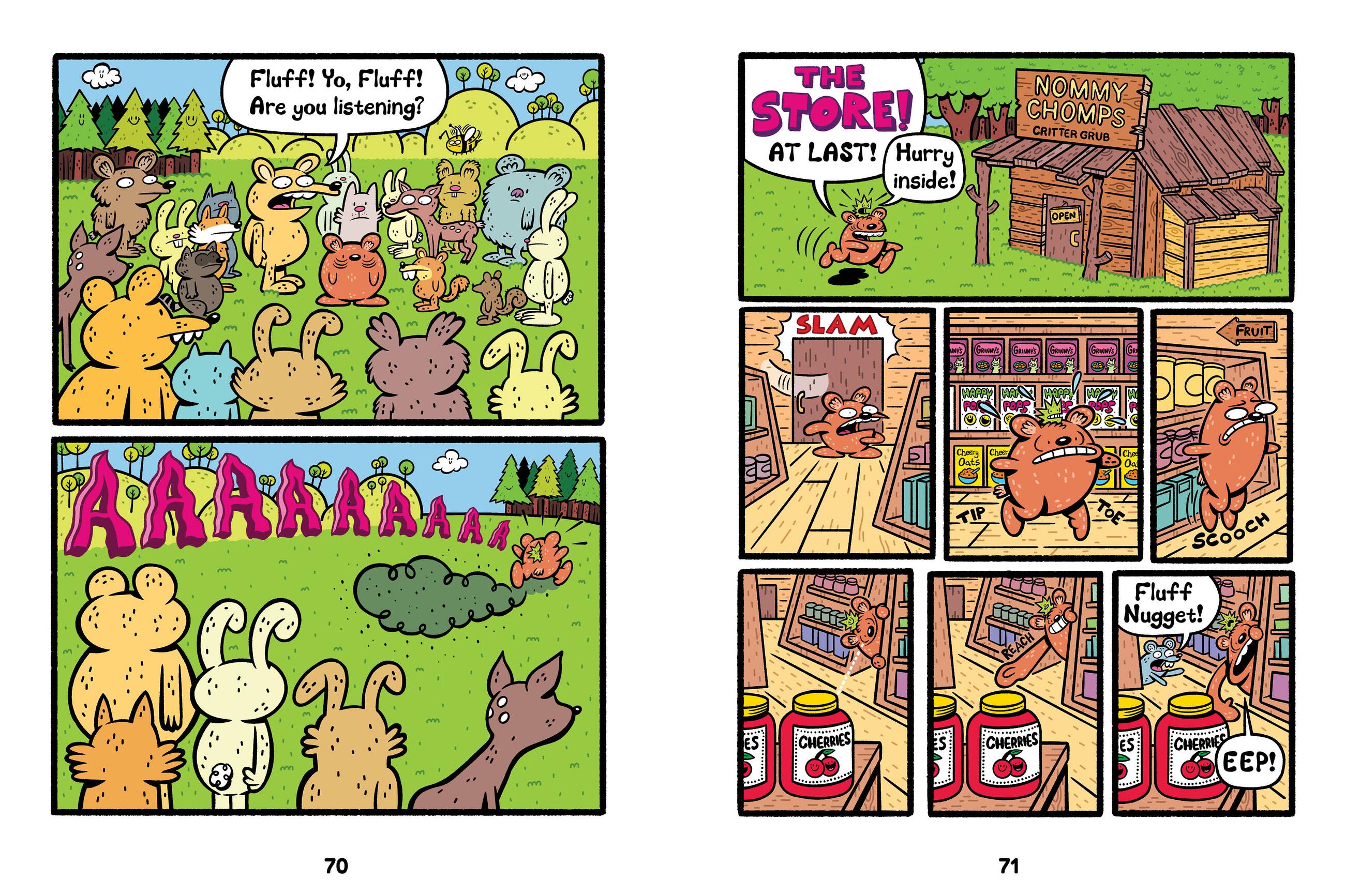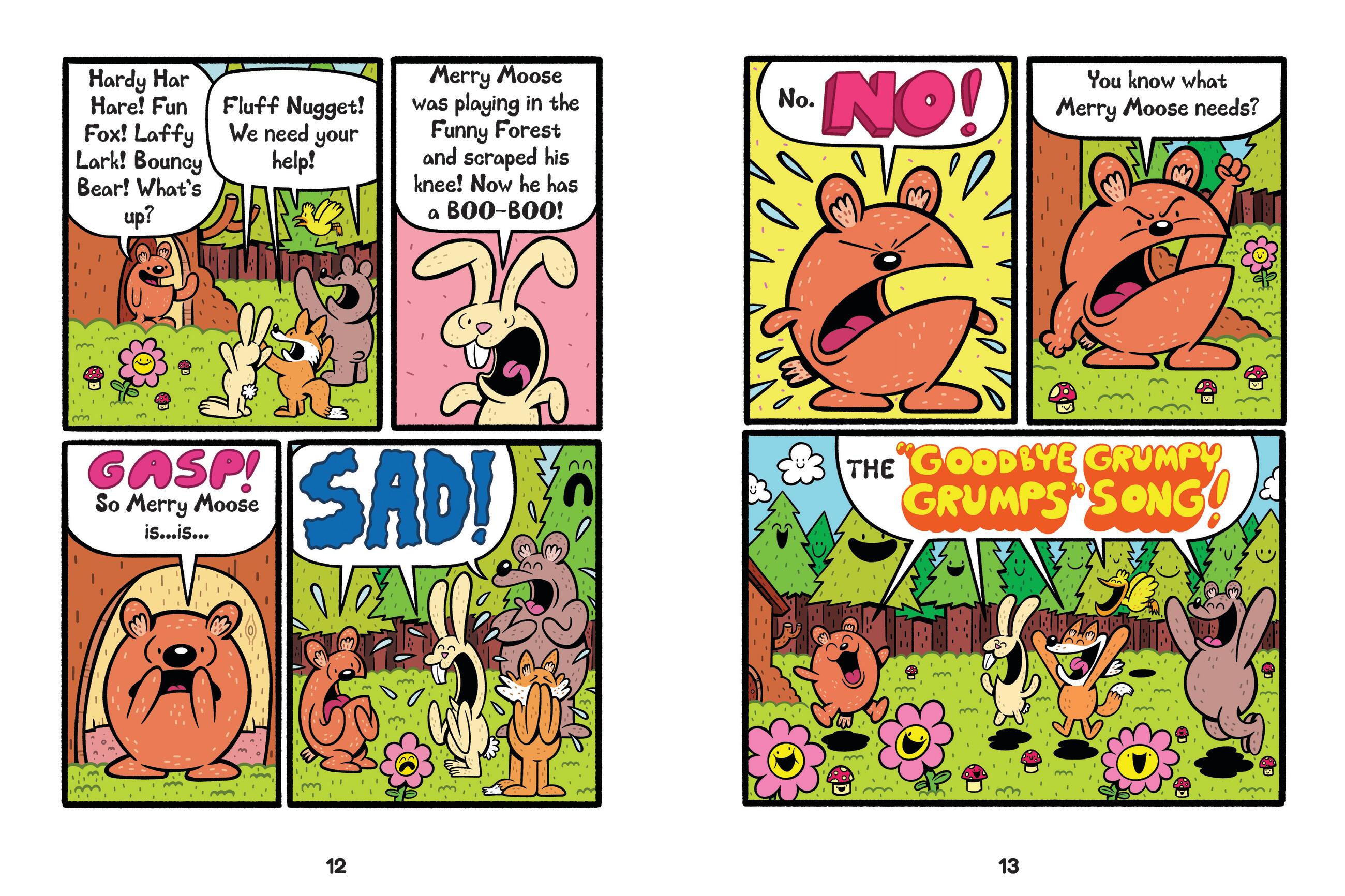 All the woodland creatures of Happy Forest (where even trees and flowers smile) go to Fluff Nugget, a fluffy, round critter of indeterminate species, when they need cheering up–he just sings them the “Goodbye Grumpy Grumps” song and they feel happy again! But when this happens too much…like, WAY too much…it starts to wear on Fluff Nugget, until he feels grumpier than anyone. After he lets loose a cry of “I AM NOT OK!” Fluff Nugget and his woodland friends must figure out a better way to boost the mood. Will the Happy Forest ever be the same again?