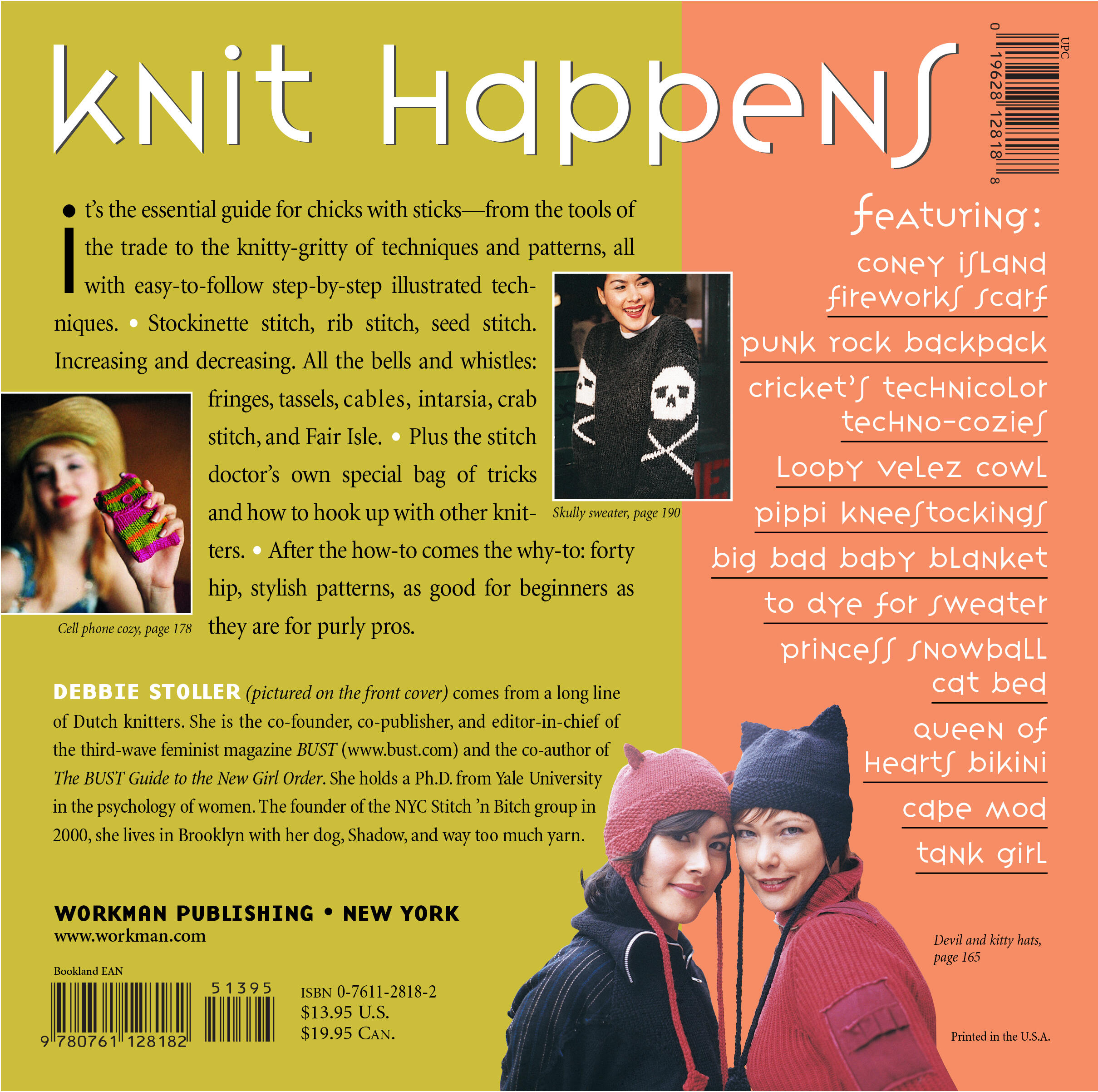 From the tools of the trade to the knitty-gritty of techniques and patterns, all with easy-to-follow step-by-step illustrated techniques. Stockinette stitch, rib stitch, seed stitch. Increasing and decreasing. All the bells and whistles: fringes, tassels, cables, intarsia, crab stitch, and Fair Isle. Plus the stitch doctor’s own special bag of tricks and how to hook up with other knitters. After the how-tos come the why-to: forty hop, stylish patterns, as good for beginners as they are for purely pros.