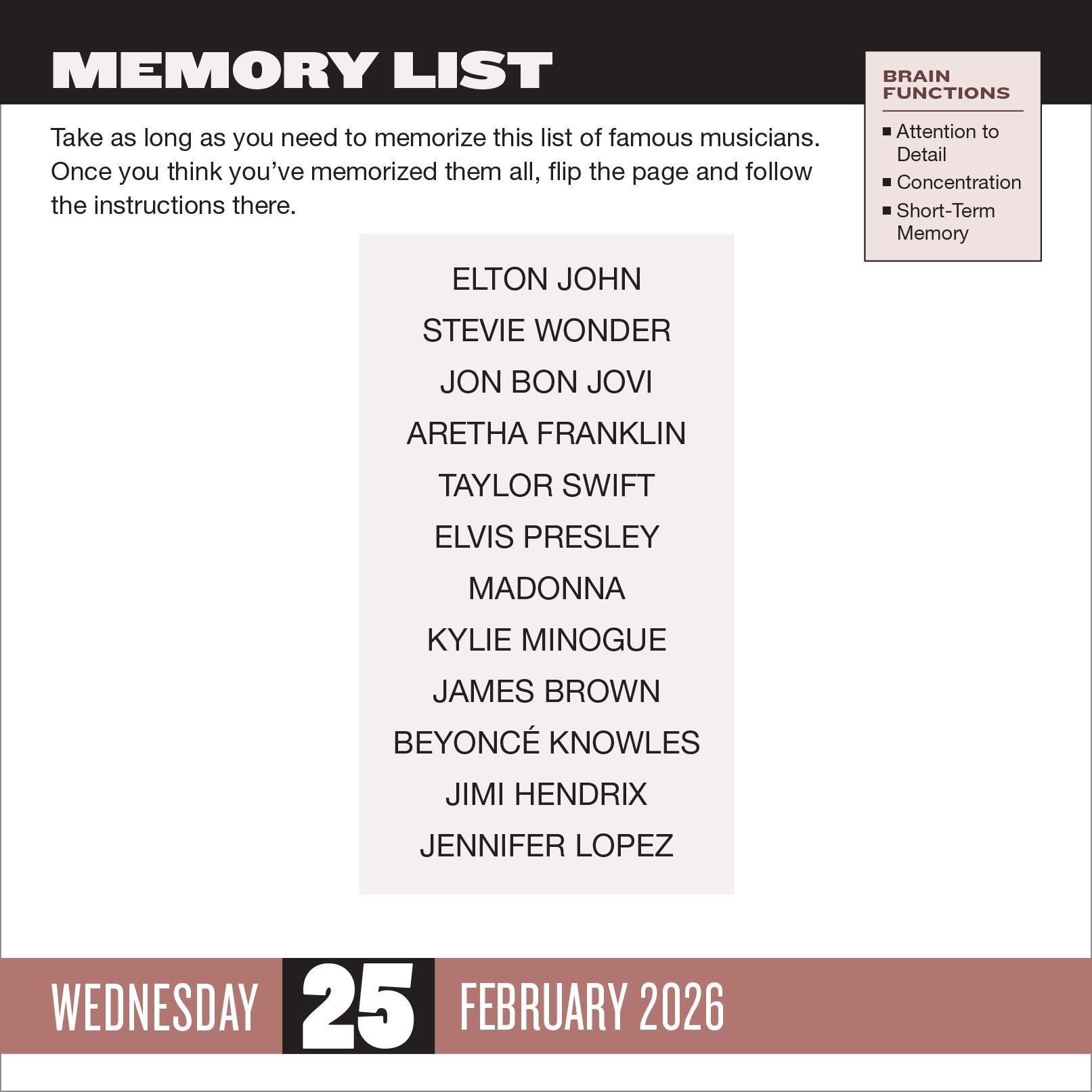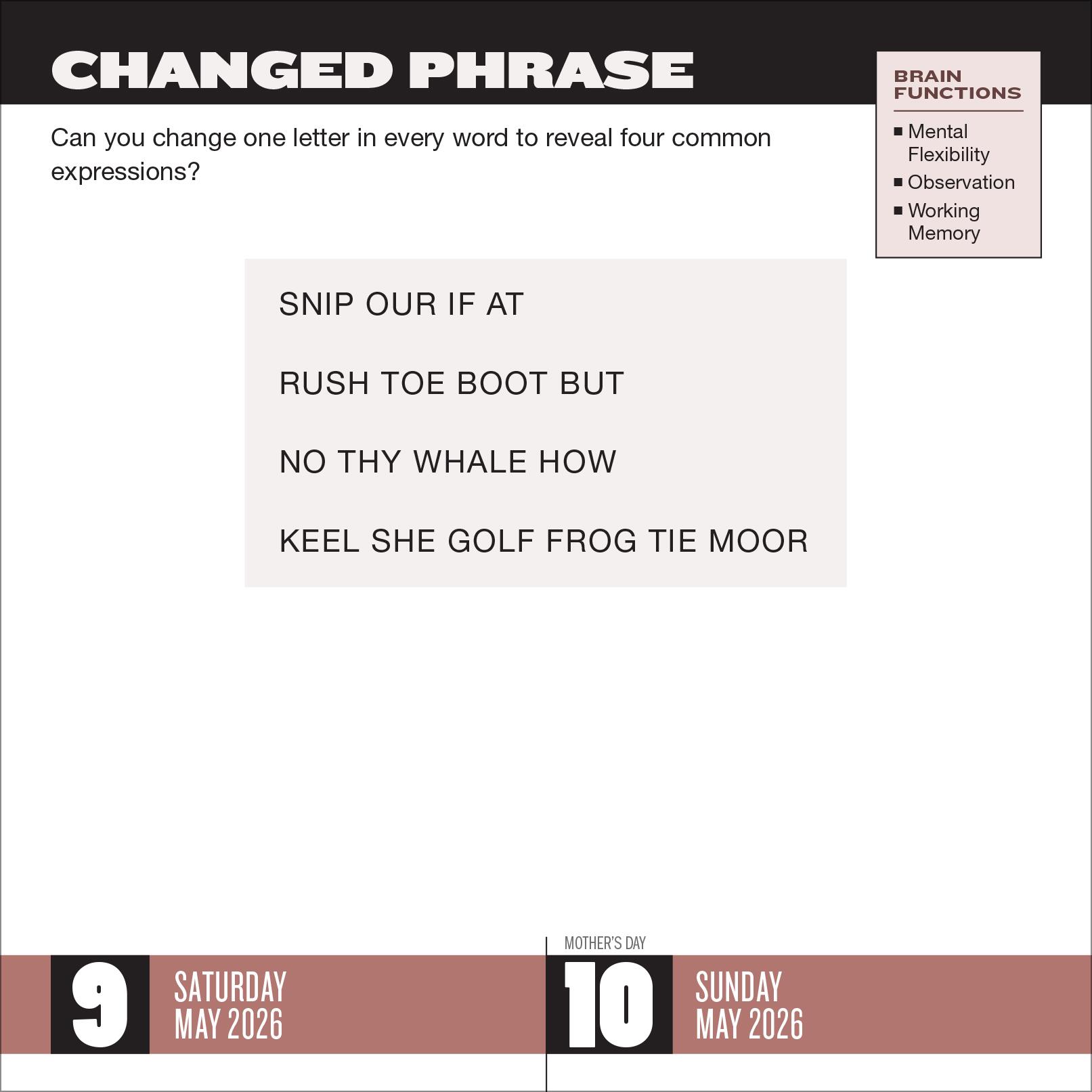 - PUZZLES TO KEEP YOUR BRAIN SHARP: Keep your new year’s resolution to keep your brain fit with a brand-new calendar that’s jam-packed with puzzles designed to strengthen concentration, short-term memory, attention to detail, and processing speed.
