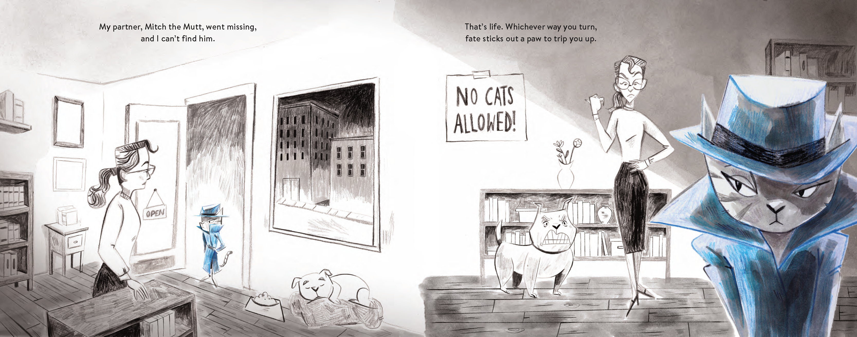 Dangerous denizens lurk around every dark corner as Kitty searches for clues in bookstores, alleyways, rooftops, and waterfronts. Who made off with the majestic Marshmallow Monkey (inspired by none other than the Maltese Falcon)? Where is the beloved Mitch the Mutt? Kitty’s got plenty of questions and not enough answers! Follow along through a tangled web of crime and intrigue as Kitty tries to solve the case.