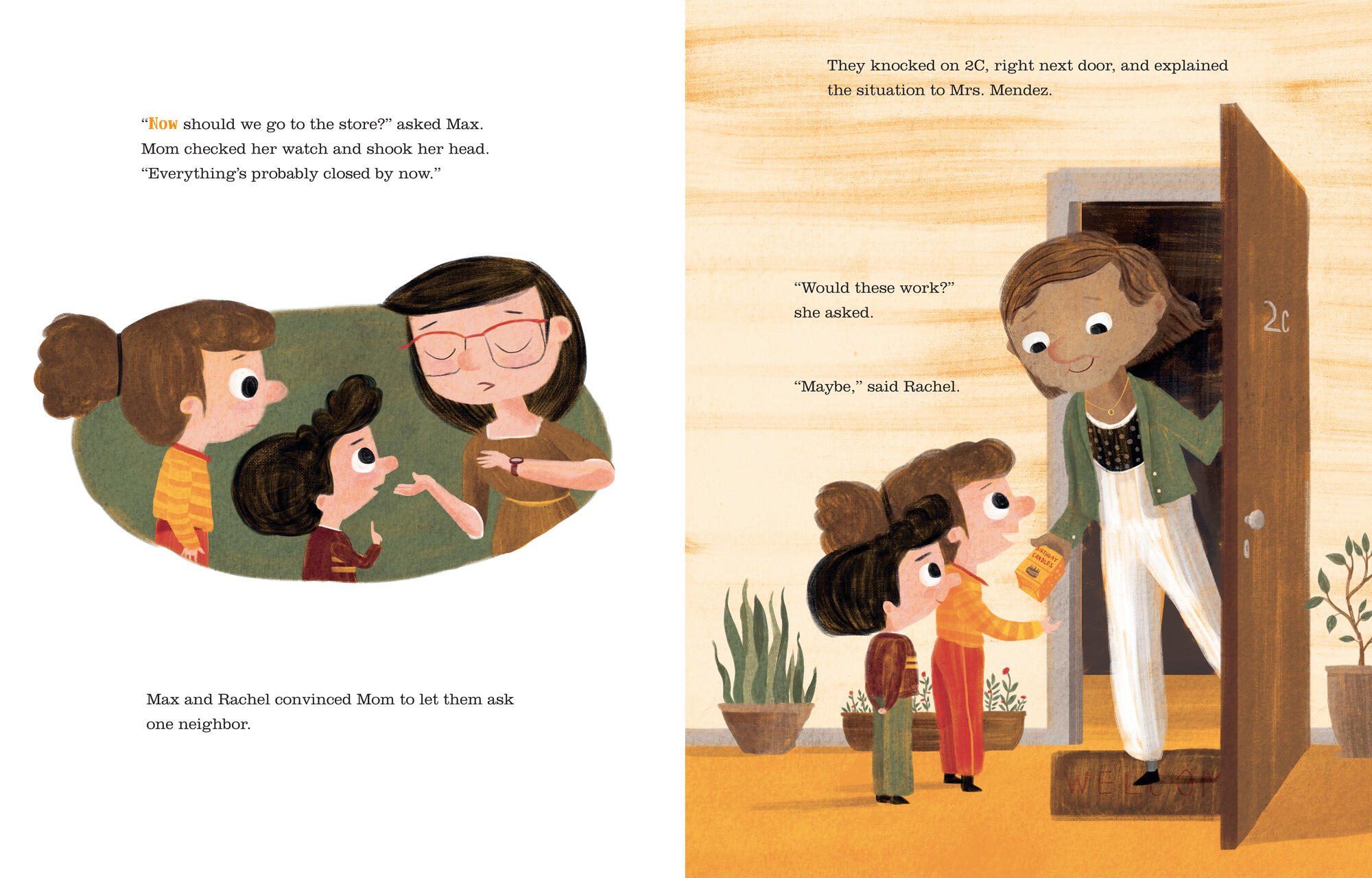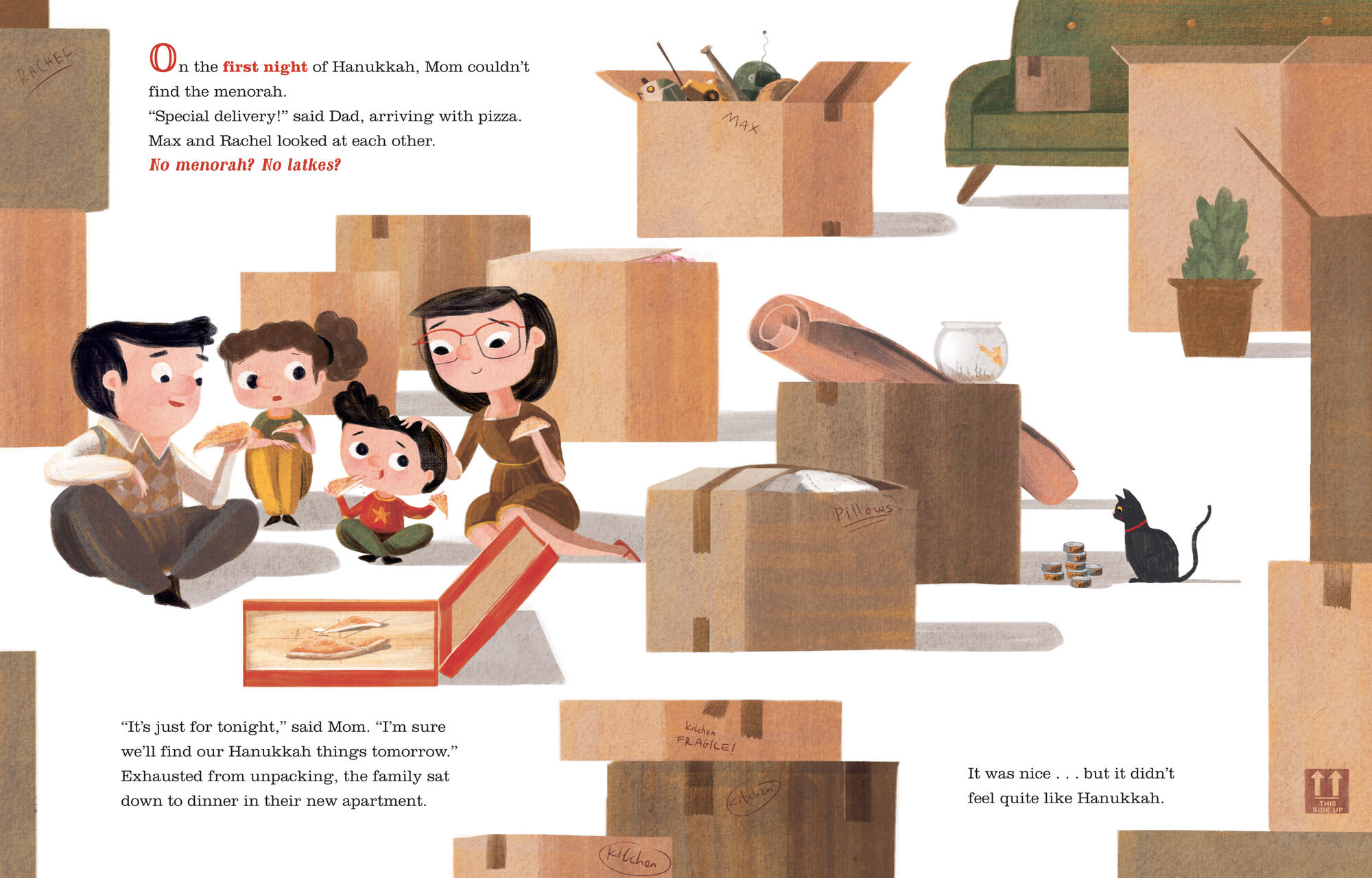 It’s Hanukkah, and Max and Rachel are excited to light the menorah in their family’s new apartment. But, unfortunately, their Hanukkah box is missing. So now they have no menorah, candles, dreidels, or, well, anything! Luckily, their neighbors are happy to help, offering thoughtful and often humorous stand-in items each night. And then, just as Hanukkah is about to end, Max and Rachel, inspired by the shamash (“helper”) candle, have a brilliant idea: they’re going to celebrate the Ninth Night of Hanukkah as a way to say thanks to everyone who’s helped them!