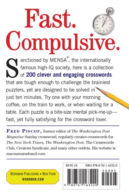 It’s puzzle nirvana for crossword lovers who have just a few minutes to spare, but still crave a challenge. Adapted from the popular Mensa 10-Minute Crossword Puzzles Page-A-Day Calendar, Mensa 10-Minute Crossword Puzzles strikes a perfect balance: The puzzles are tough enough to be sanctioned by Mensa, the internationally famous high-IQ society, but are designed to be solvable in ten minutes or less.