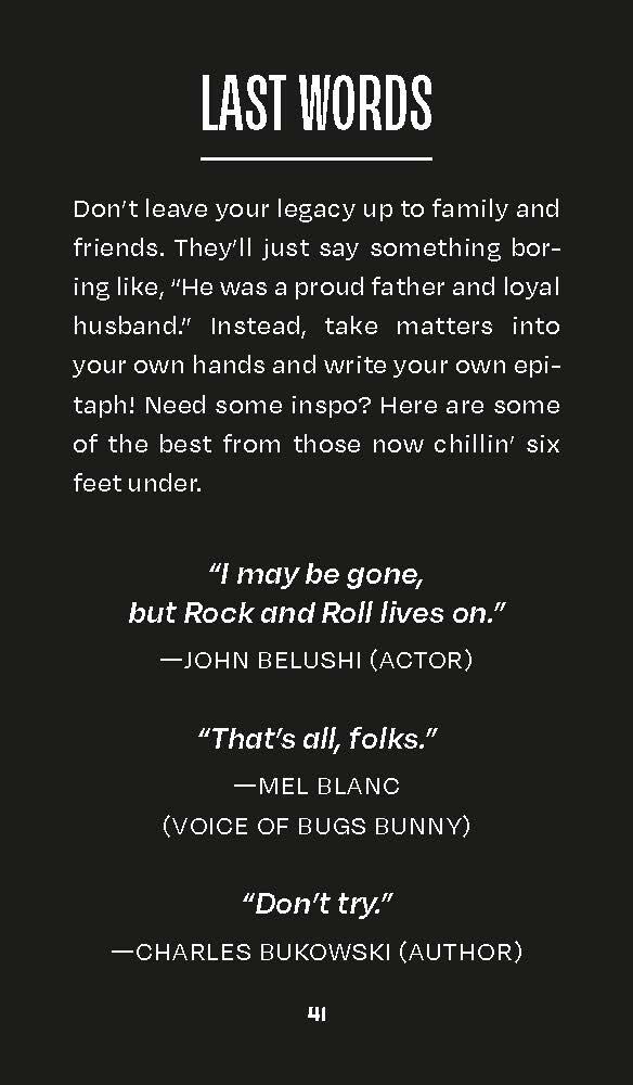 - Fully Illustrated Pocket Guide to Death: The full-color companion book includes all facets of death trivia, from the odds of dying from freak accidents to famous movie deaths and the origins of idioms like “kick the bucket.”