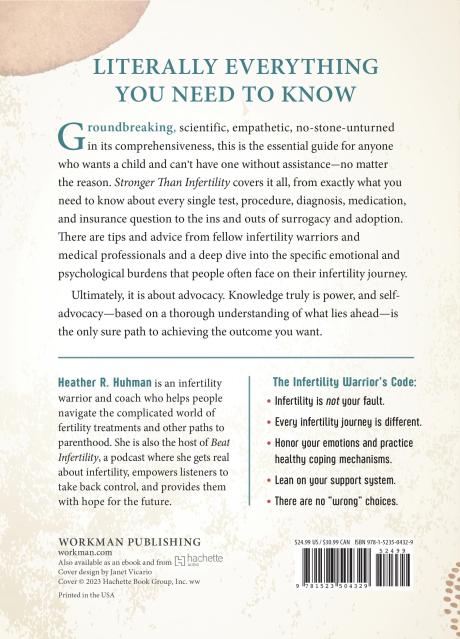 Author Heather Huhman guides readers through every stage of the process—from knowing when to seek medical advice to parenting after infertility, and everything in between. There’s the medical nitty gritty: getting a diagnosis (or not); selecting a fertility clinic that’s right for you; understanding IUI and IVF and genetic testing; a comprehensive list of medications and their side effects, and much more. There are emotional high and lows: staying hopeful while managing grief and depression, maintaining and strengthening your relationship, and navigating religious and ethical concerns. And then there is the practical and often complicated questions around affording treatments, dealing with your workplace (including the military), and everything you need to know about insurance and fertility treatments.Stronger Than Infertility breaks down complicated clinical information and expert medical advice from top specialists in the field. The book includes first-person stories and hard-won advice from women who have been down this long and often painful road (Huhman included) and offers a clear-eyed look at the emotional and psychological landmines that come with the journey. The result is a book that inspires as much as it educates and is a much-needed source of support and inspiration for readers hungry for understanding and hope.