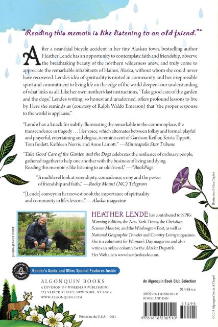 The Alaskan landscape—so vast, dramatic, and unbelievable—may be the reason the people in Haines, Alaska (population 2,400), so often discuss the meaning of life. Heather Lende thinks it helps make life mean more. Since her bestselling first book, If You Lived Here, I’d Know Your Name, a near-fatal bicycle accident has given Lende a few more reasons to consider matters both spiritual and temporal. Her idea of spirituality is rooted in community, and here she explores faith and forgiveness, loss and devotion—as well as raising totem poles, canning salmon, and other distinctly Alaskan adventures. Lende’s irrepressible spirit, her wry humor, and her commitment to living a life on the edge of the world resonate on every page. Like her own mother’s last wish—take good care of the garden and dogs—Lende’s writing, so honest and unadorned, deepens our understanding of what links all humanity.