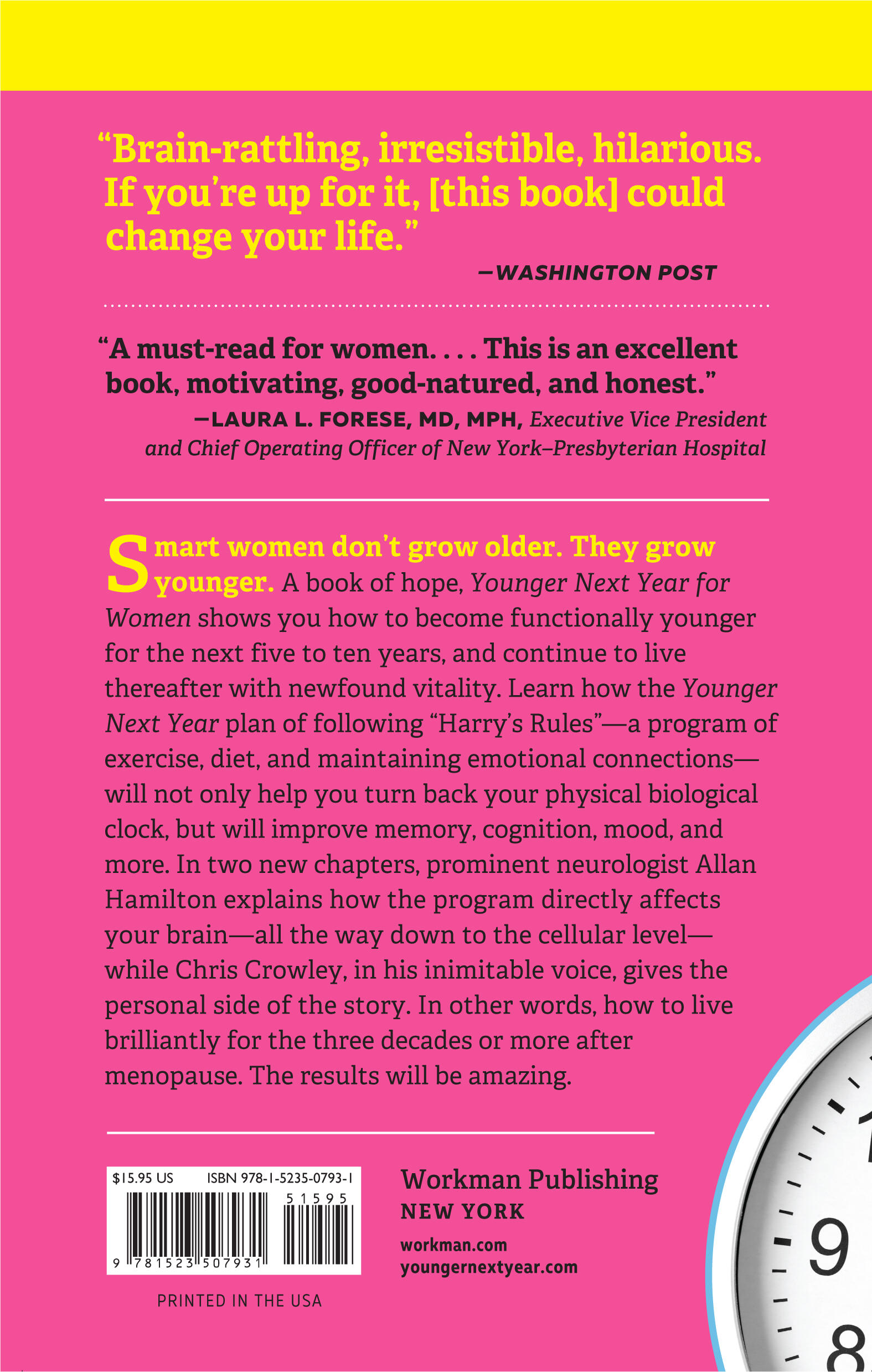 A book of hope, Younger Next Year for Women shows you how to become functionally younger for the next five to ten years, and continue to live thereafter with newfound vitality. Learn how the Younger Next Year plan of following “Harry’s Rules”—a program of exercise, diet, and maintaining emotional connections—will not only help you turn back your physical biological clock, but will improve memory, cognition, mood, and more. In two new chapters, prominent neurologist Allan Hamilton explains how the program directly affects your brain—all the way down to the cellular level—while Chris Crowley, in his inimitable voice, gives the personal side of the story. In other words, how to live brilliantly for the three decades or more after menopause. The results will be amazing.