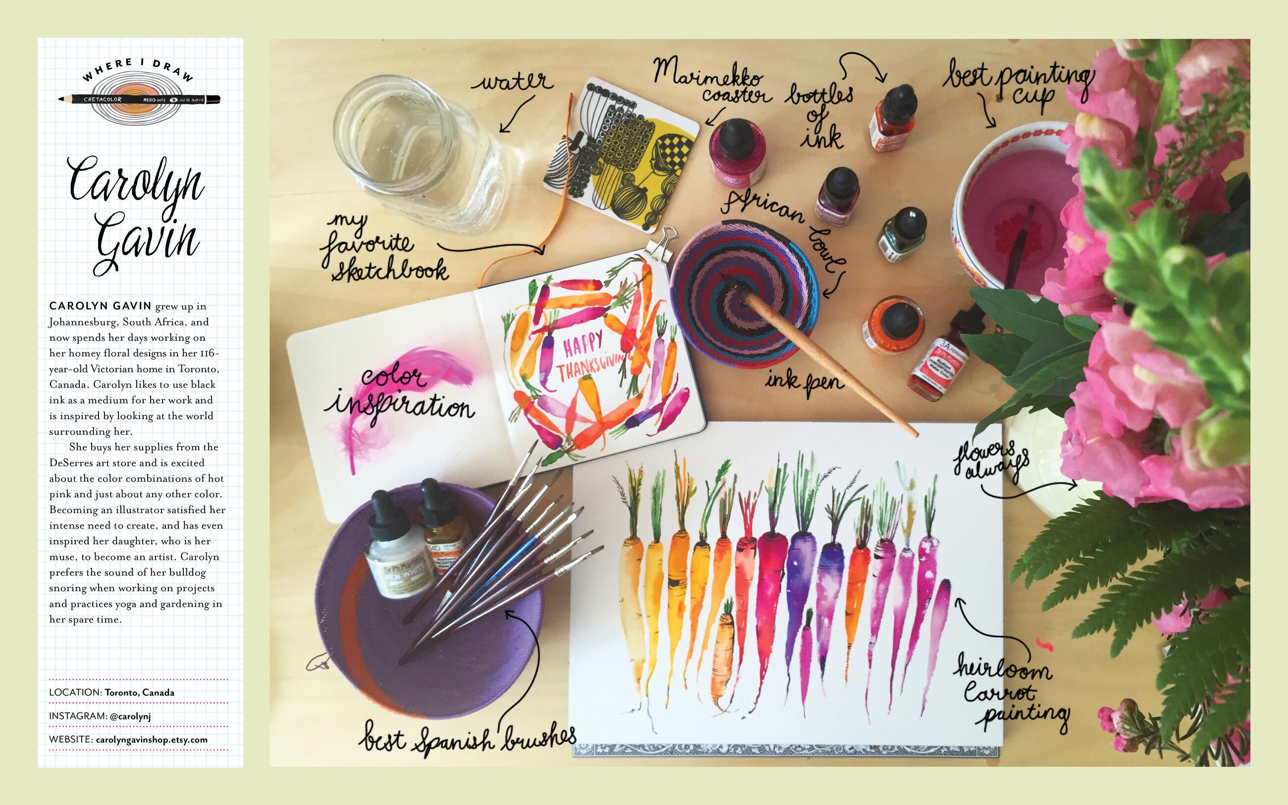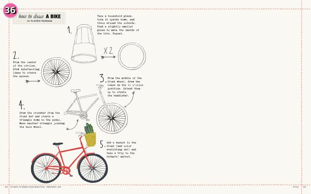 The lessons, 50 in all, show how to render the kinds of things we see every day: a bouquet of flowers, a beloved teacup, colorful mittens, the kitchen table, a bike, jam jars, a cat, an apple tree. Along the way we learn about color, materials, perspective, tools, and negative space.