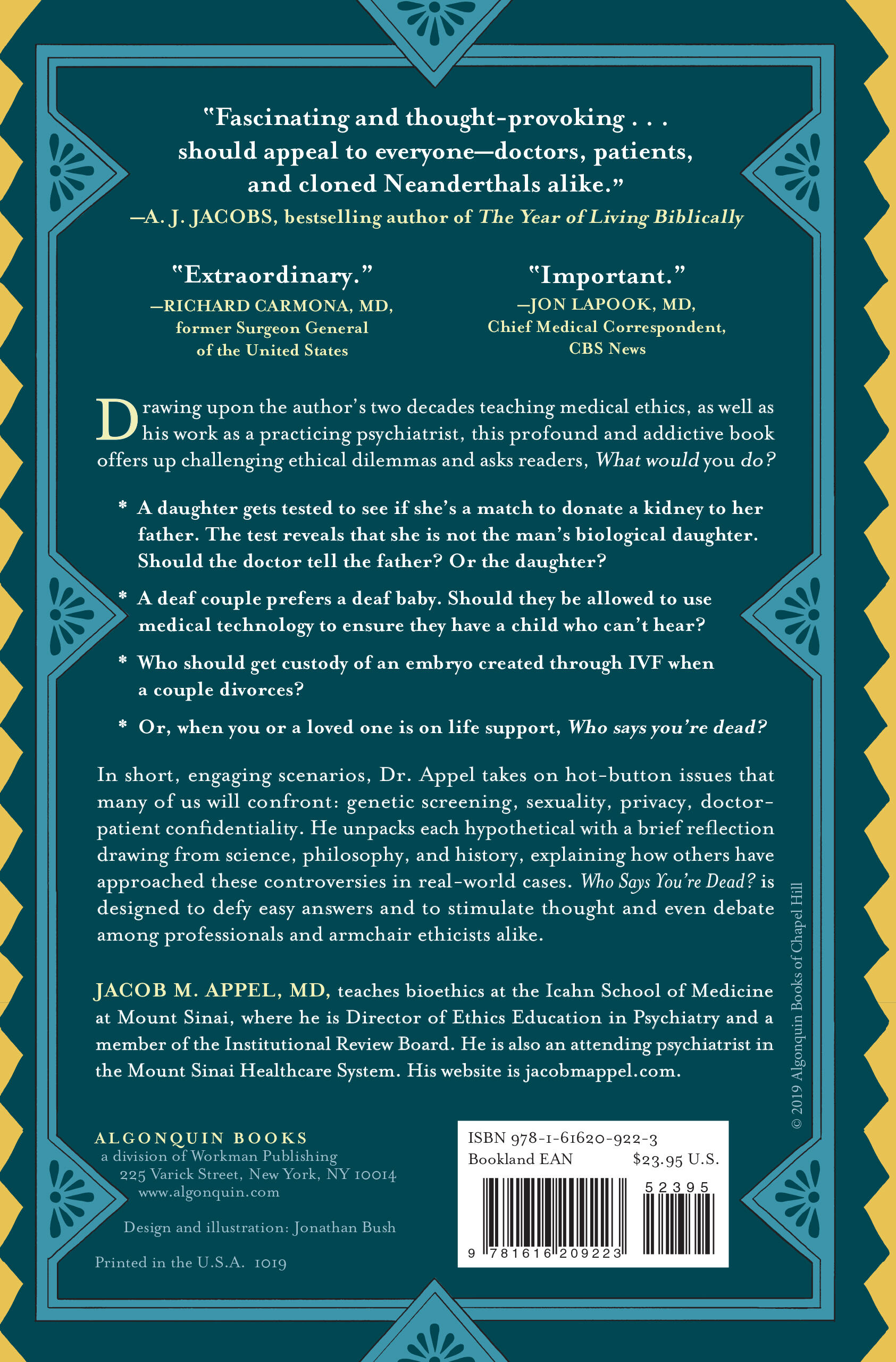 “Appel's scenario approach works well, as readers are challenged to weigh the morality of decisions in our increasingly complex medical world. An easy-to-digest compendium of bioethical issues that provides plenty of food for thought.”A. J. Jacobs, bestselling author of The Year of Living Biblically “Important and provocative. Physician, lawyer, and bioethicist: what a perfect trifecta for the author of a book on ethical issues in medicine. I read it from start to finish in one sitting.”—Jon LaPook, M.D., Chief Medical Correspondent, CBS News “Dr. Appel adroitly places the dangerous flames of ethical dilemmas into a terrarium for careful examination so we don’t burn ourselves.”—Mehmet Oz, M.D, Professor of Surgery, Columbia University, host or The Dr. Oz Show “Dr. Appel in his extraordinary book has done a service for the public and health professionals by clearly illustrating the present and evolving medical ethical issues before us. This is a provocative and informative read for all!”—Richard Carmona, MD,MPH,FACS, 17th Surgeon General of the United States “The most thorough set of challenges in tightly reasoned and highly readable scenarios that should be read not only by students and teachers, but by every member of Congress before they vote on issues with ethical implications, which is nearly every vote. An important contribution to philosophy and science. I dare you to try a few.”—Michael Shermer, publisher of Skeptic Magazine, monthly columnist Scientific American, author The Moral Arc “This book will enliven your dinner conversation for months to come. Not only is Who Says You're Dead? a lot of fun; its topic—how technology and ethics co-evolve—is of the utmost importance.”—William Poundstone, author of Head in the Cloud: Why Knowing Things Still Matters When Facts Are So Easy to Look Up “I couldn’t put it down. Dr. Appel offers analyses that are spot on! Every medical student should be made to read this book. Whether compelling them to do that is ethical or not is an easy choice.”—Joe Schwarcz, host of “The Dr. Joe Show” and author of A Feast of Science “Who Says You're Dead? entertains as it educates. Dr. Appel ranges from organ transplantation to embryo custody to voluntary castration and confidentiality laws and, yes, even to the cloning of Neanderthals. It is an exotic journey, and strongly recommended.”—E. Fuller Torrey, author of Emerging Brains, Emerging Gods “Jacob Appel is a doctor, lawyer, bio-ethicist, and terrific writer—the perfect person to pose fascinating ethical conundrums and guide us toward practical answers. The biggest messes in modern medicine result when medical technology outpaces medical ethics. This lively book helps right the balance.”—Allen Frances, MD, chair of the DSM-IV Task Force and author of Saving Normal “When life seems too simple or dull, open this book. Pick a conundrum, any conundrum. Within a few minutes, you'll be transported into imagining your life as impossibly complex and your decisions absolutely vital. This is a fascinating exercise.”—Jay Allison, producer and host of NPR’s This I Believe