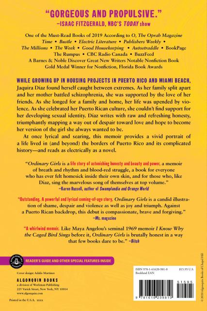 Winner of a Whiting Award for Nonfictionbut also about the triumphant, spirited storyteller who survives to tell the tale. Jaquira Díaz is our contemporary Scheherazade, telling stories to keep herself alive and whole, and us her readers mesmerized and wanting more. And we get it: there is more life packed on each page of Ordinary Girls than some lives hold in a lifetime.”—Julia Alvarez, author of How the García Girls Lost Their Accents and In the Time of the Butterflies