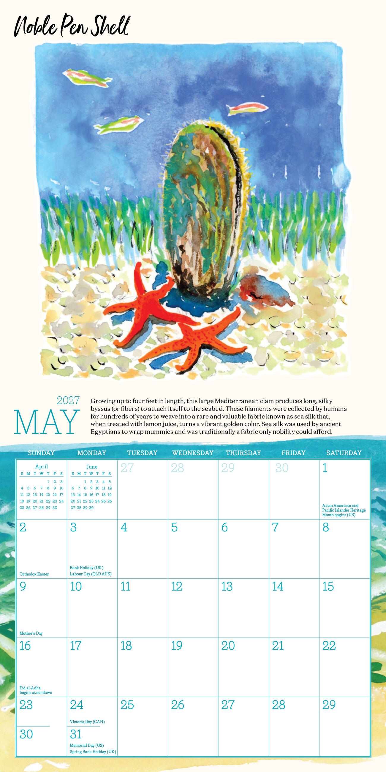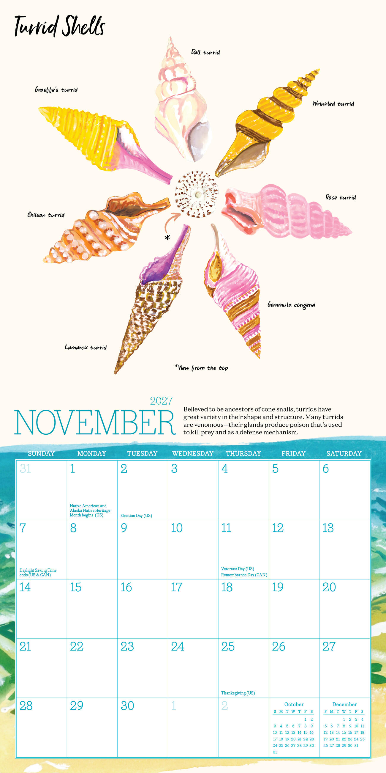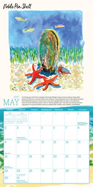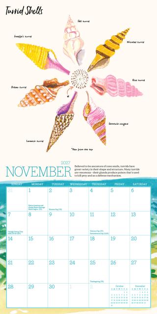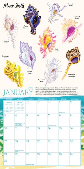- LET’S SHELL-EBRATE: Jessie King Regunberg’s beautiful illustrations bring the shore to you. Discover different hand-painted seashells each month, plus surprising facts about these small treasures.