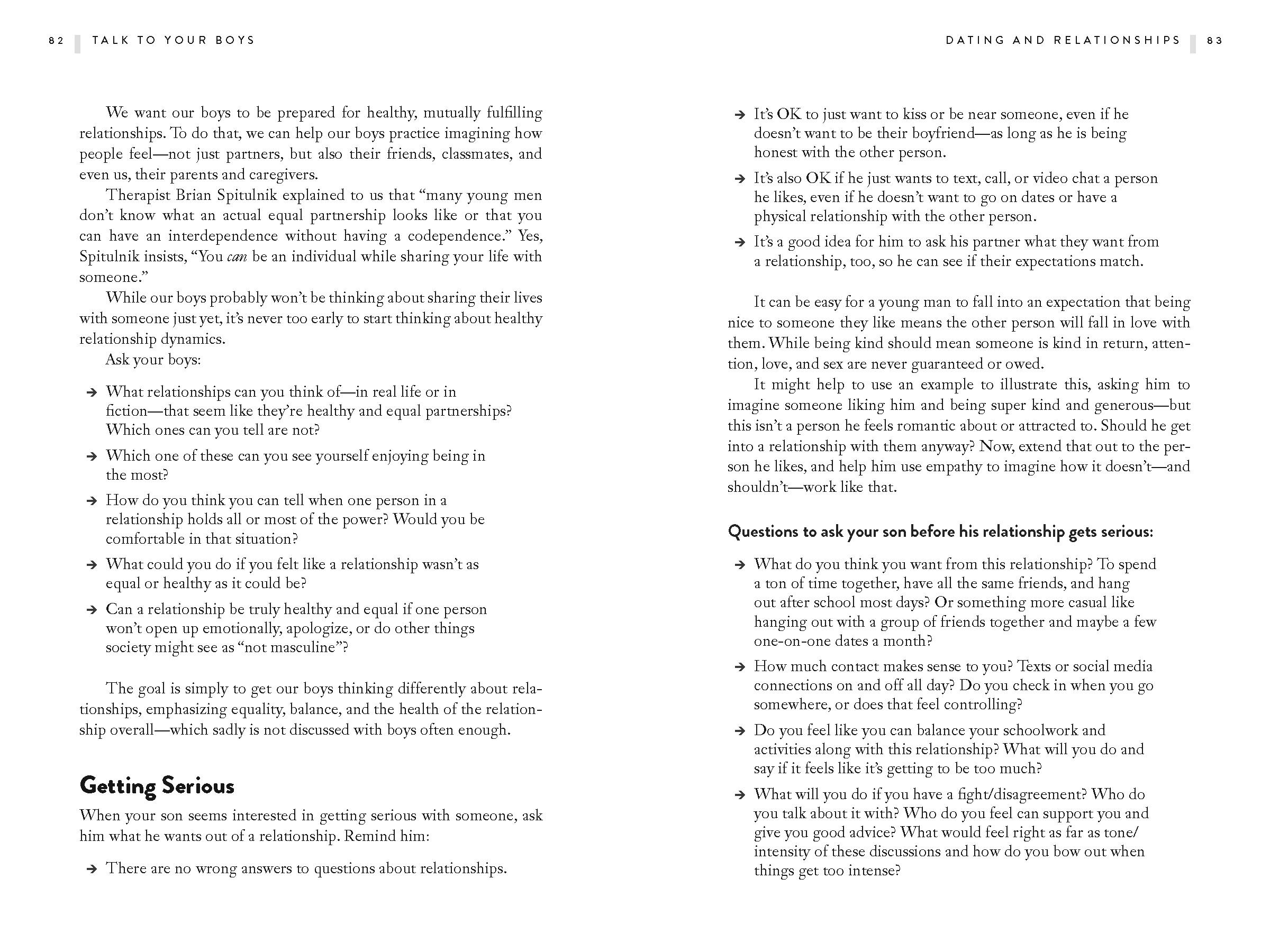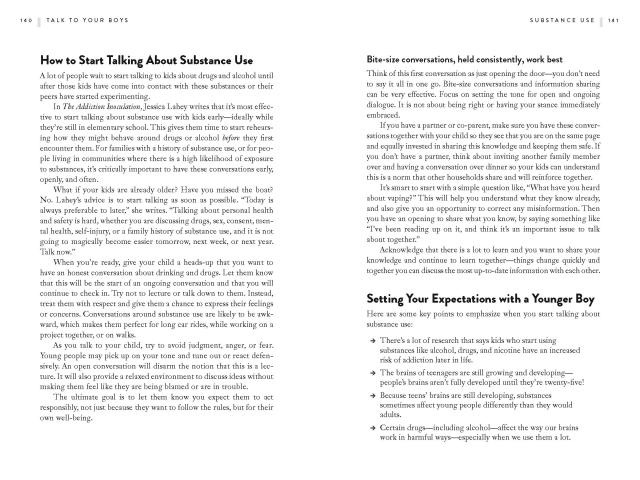 Talk to your Boys is a practical guide to communicating with your tween and teen boy with the goal of raising young men who care about themselves and others. The book focuses on 16 essential and wide‑ranging conversations on mental health and masculinity, sex and consent, money and power, violence and guns, and more. Packed with helpful advice, conversation starters, tips and scripts, Talk to Your Boys is designed to help families get better at having these crucial, but sometimes awkward, discussions with the larger goal to raise emotionally intelligent men who aren’t hemmed in by outdated ideas of masculinity.