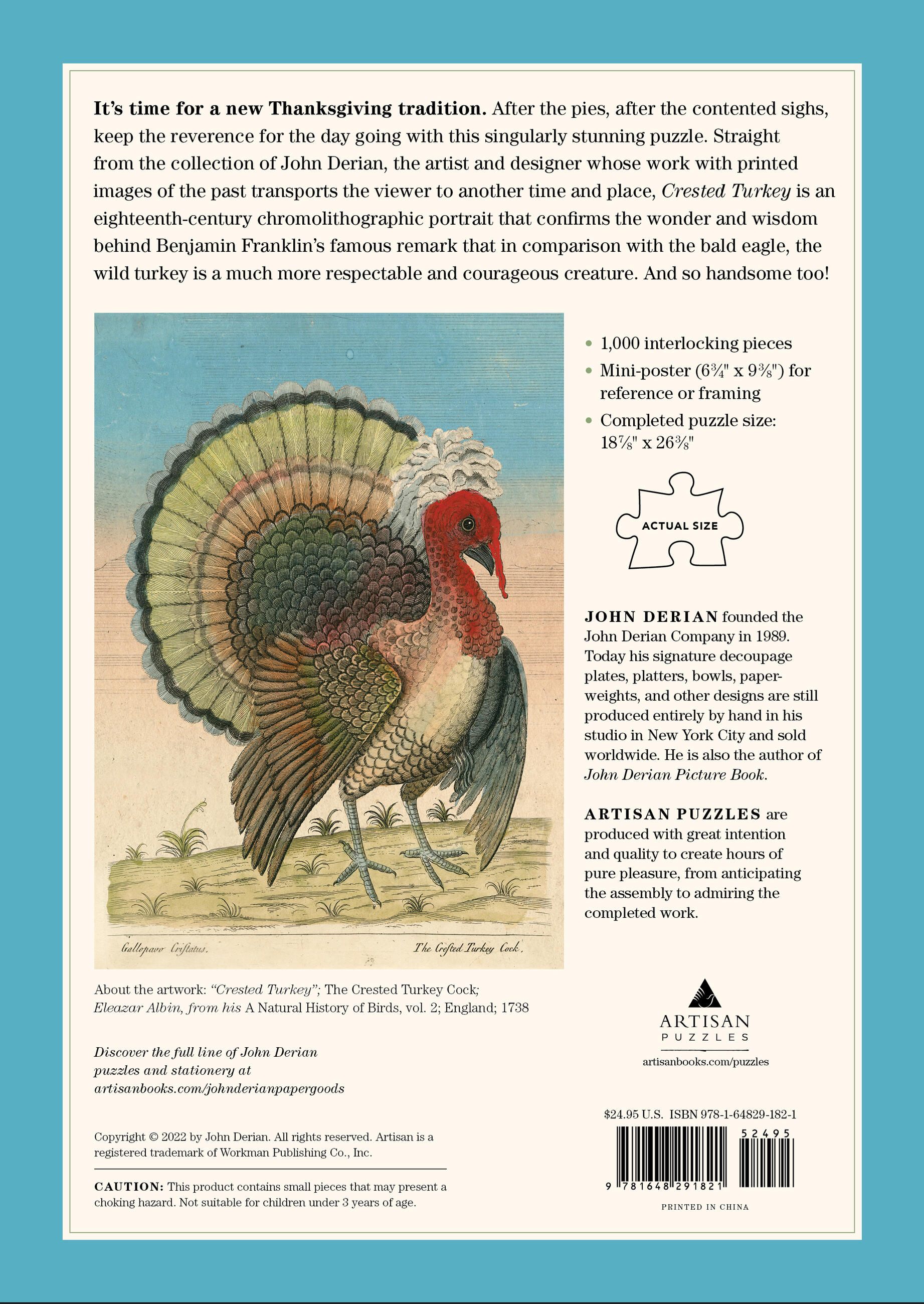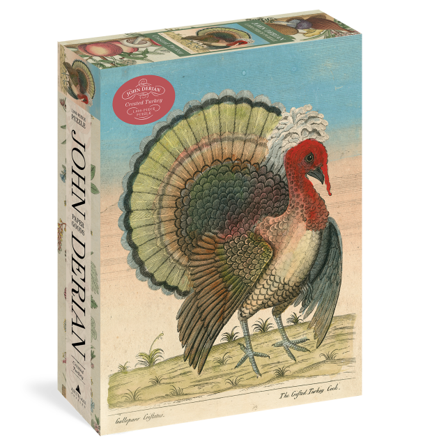 It’s time for a new Thanksgiving tradition. After the pies, after the contented sighs, keep the reverence for the day going with this singularly stunning puzzle. Straight from the collection of John Derian, the artist and designer whose work with printed images of the past transports the viewer to another time and place, Crested Turkey is a nineteenth-century chromolithographic portrait that confirms the wonder and wisdom behind Benjamin Franklin’s famous remark that in comparison with the bald eagle, the wild turkey is a much more respectable and courageous creature. And so handsome too!