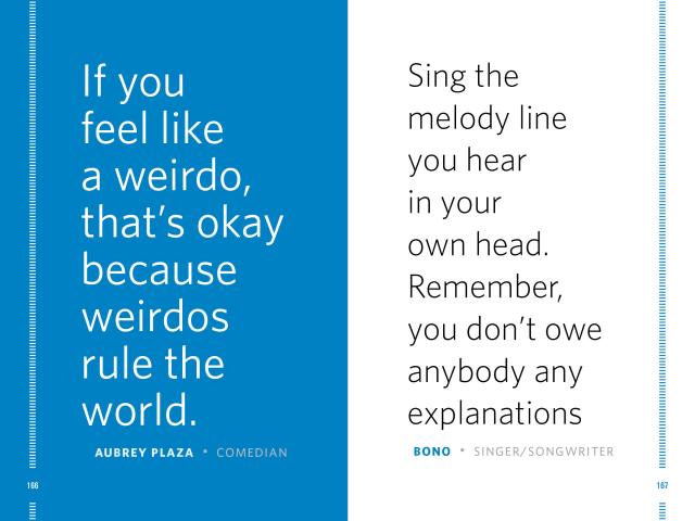 Do you ever feel different? A little weird, a little wacky? It’s time to own it, because, as Meryl Streep proclaimed, “what makes you different or weird, that’s your strength.” In this inspiring collection, singers, poets, actors, activists, comedians, designers, athletes, and philosophers share wise and pithy reflections on what it’s like to march to the beat of a different drummer. Every statement is a powerful, positive reminder that to live successfully is to be completely unapologetically you.