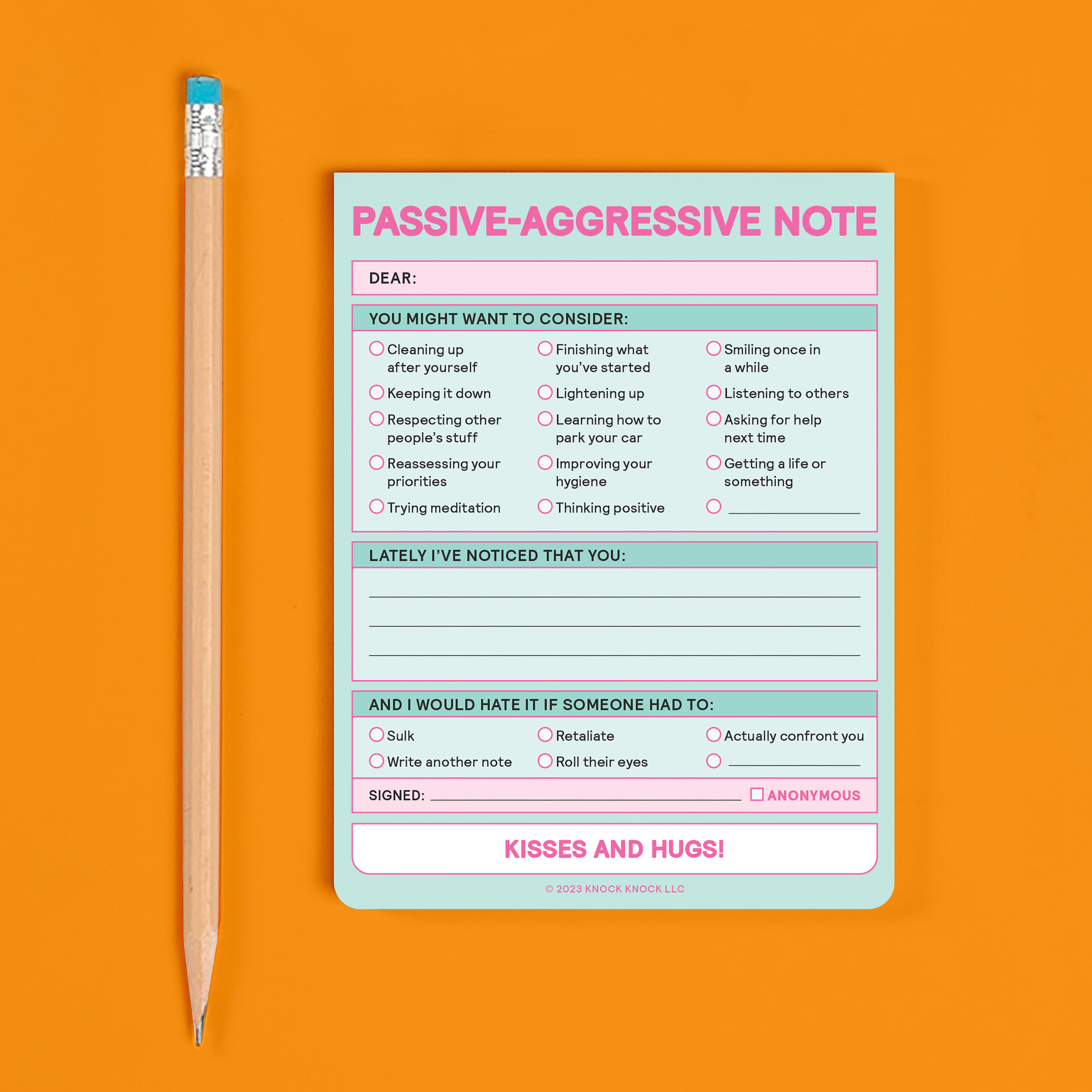 Express yourself the thinly veiled way! This passive-aggressive paper tantrum notepad lets you clearly but (somewhat) subtly address a range of behavioral failures in others including poor attitude and lackluster hygiene. Great for communication between roommates and coworkers!