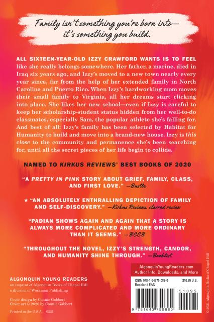 All sixteen-year-old Izzy Crawford wants is to feel like she really belongs somewhere. Her father, a marine, died in Iraq six years ago, and Izzy’s moved to a new town nearly every year since, far from the help of her extended family in North Carolina and Puerto Rico. When Izzy’s hardworking mom moves their small family to Virginia, all her dreams start clicking into place. She likes her new school—even if Izzy is careful to keep her scholarship-student status hidden from her well-to-do classmates and her new athletic and popular boyfriend. And best of all: Izzy’s family has been selected by Habitat for Humanity to build and move into a brand-new house. Izzy is this close to the community and permanence she’s been searching for, until all the secret pieces of her life begin to collide.