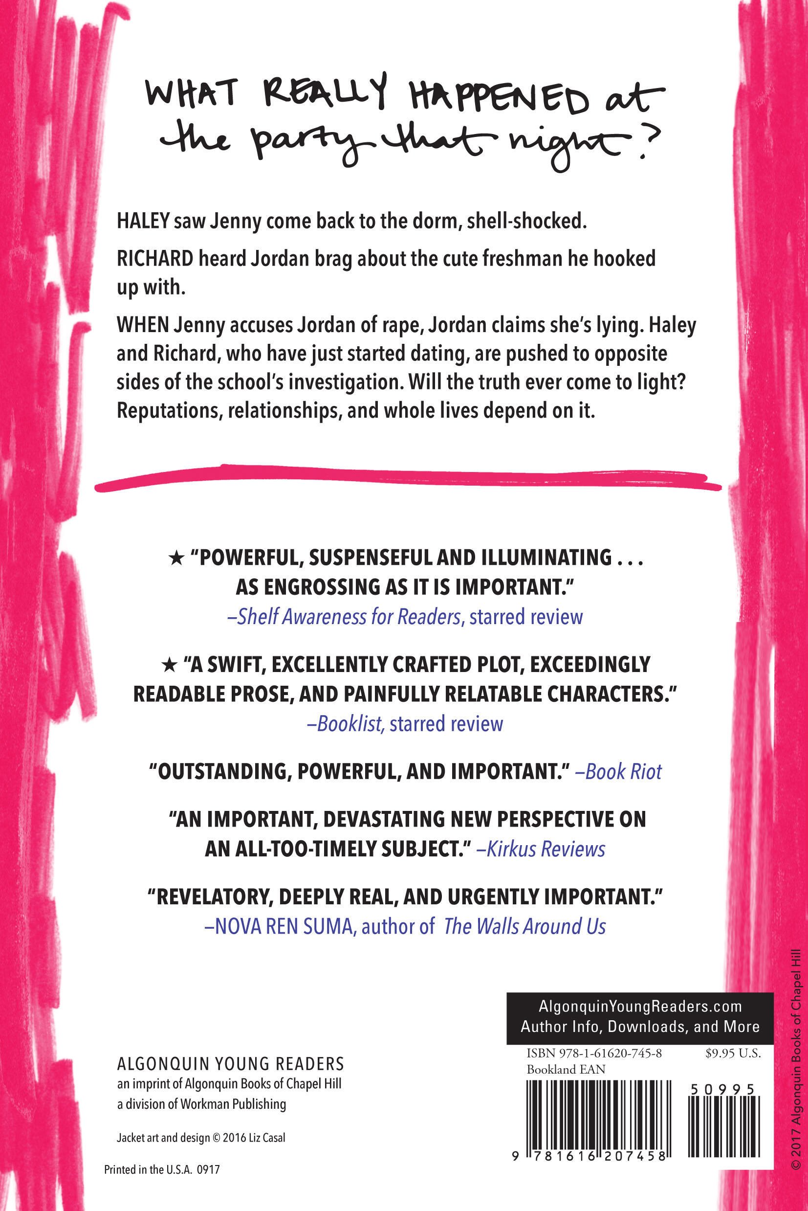 “This is an important and, unfortunately, timely novel . . . This isn’t just a book that all young men and women should read; it’s gripping and human enough that many will want to. Shelve and display alongside Laurie Halse Anderson’s Speak and Courtney Summers’s All the Rage.”
