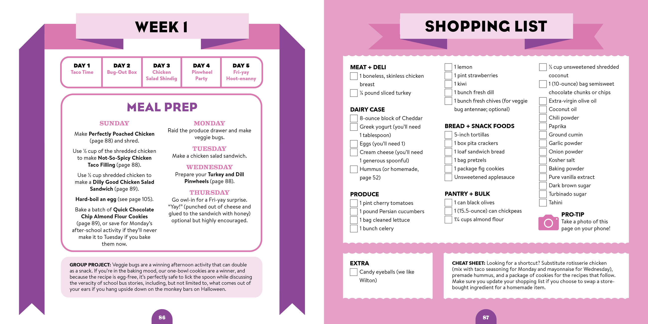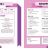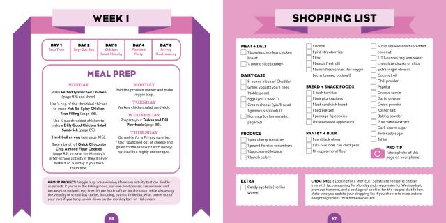 - Weekly menus, meal prep guides, shopping lists, and cheat sheets