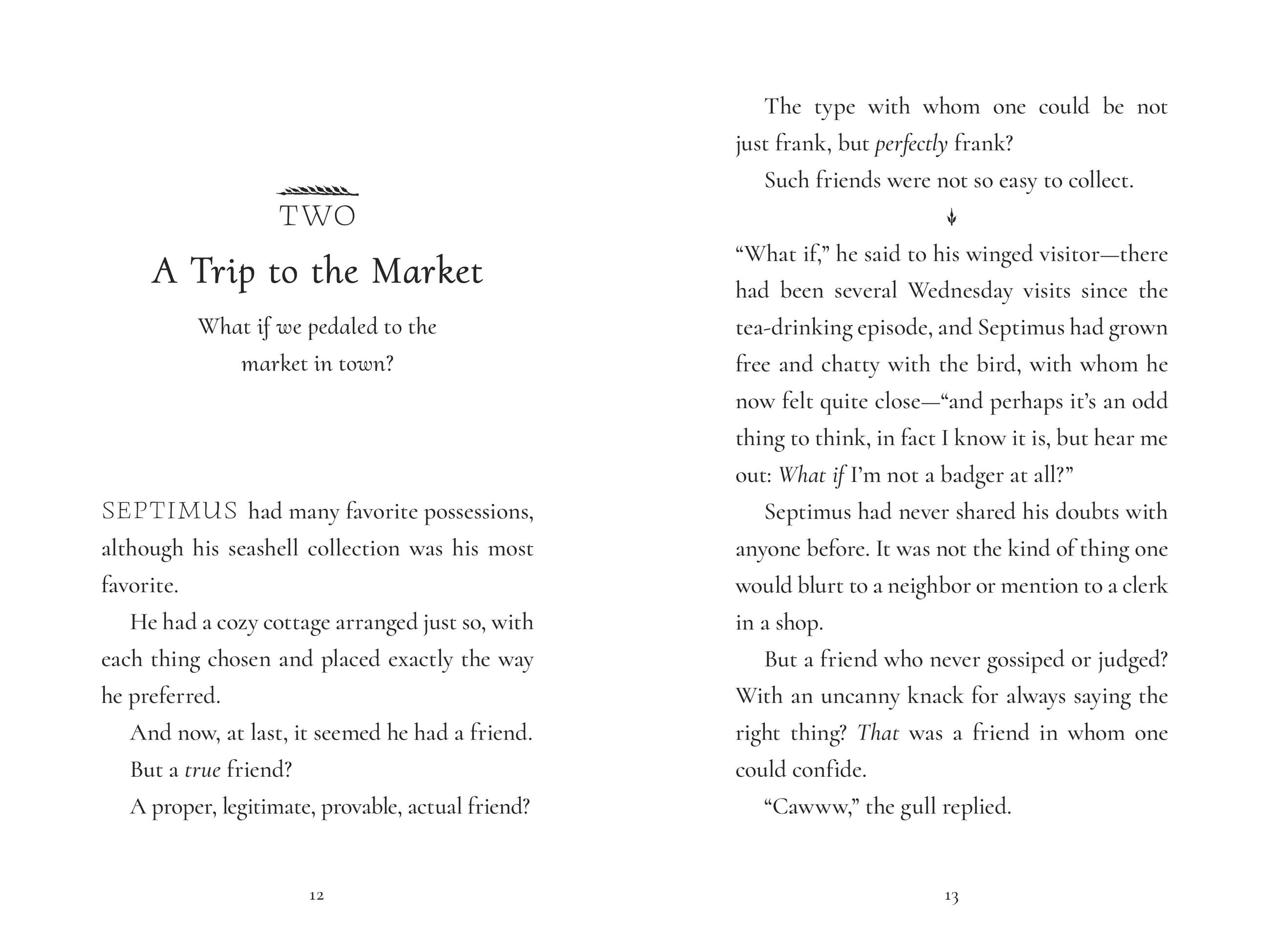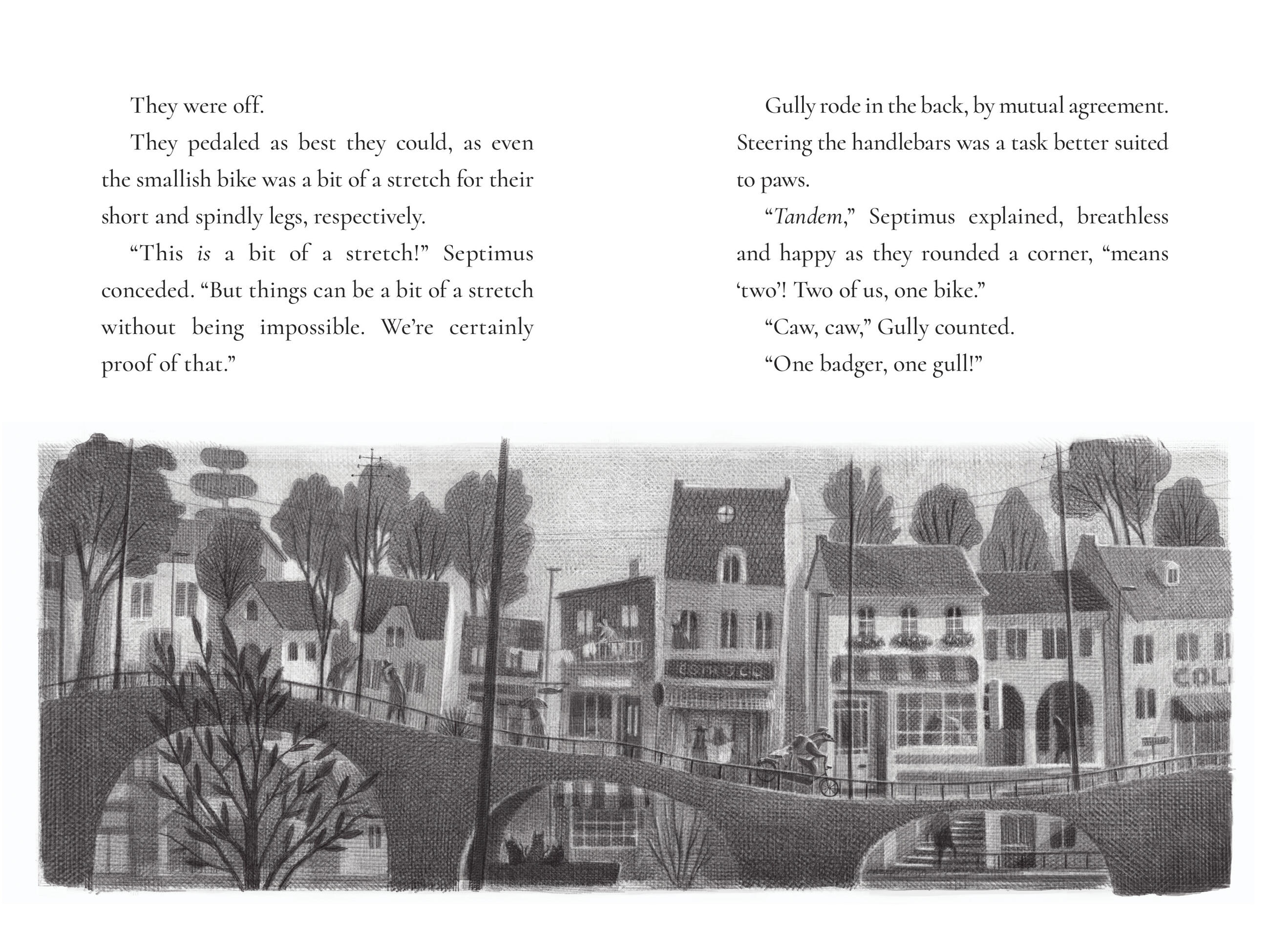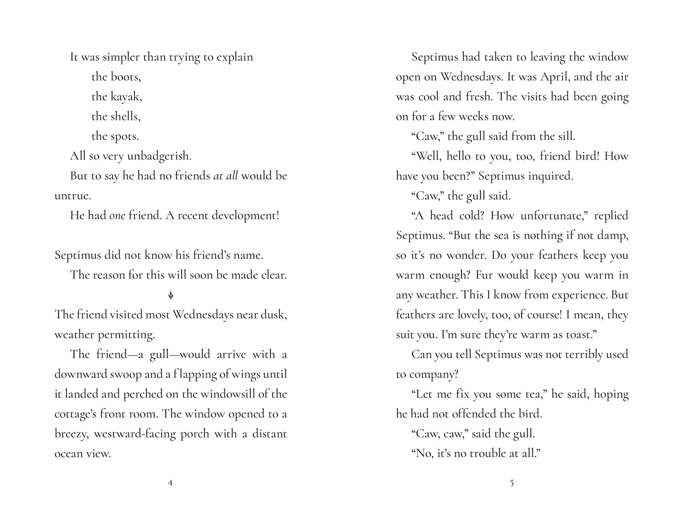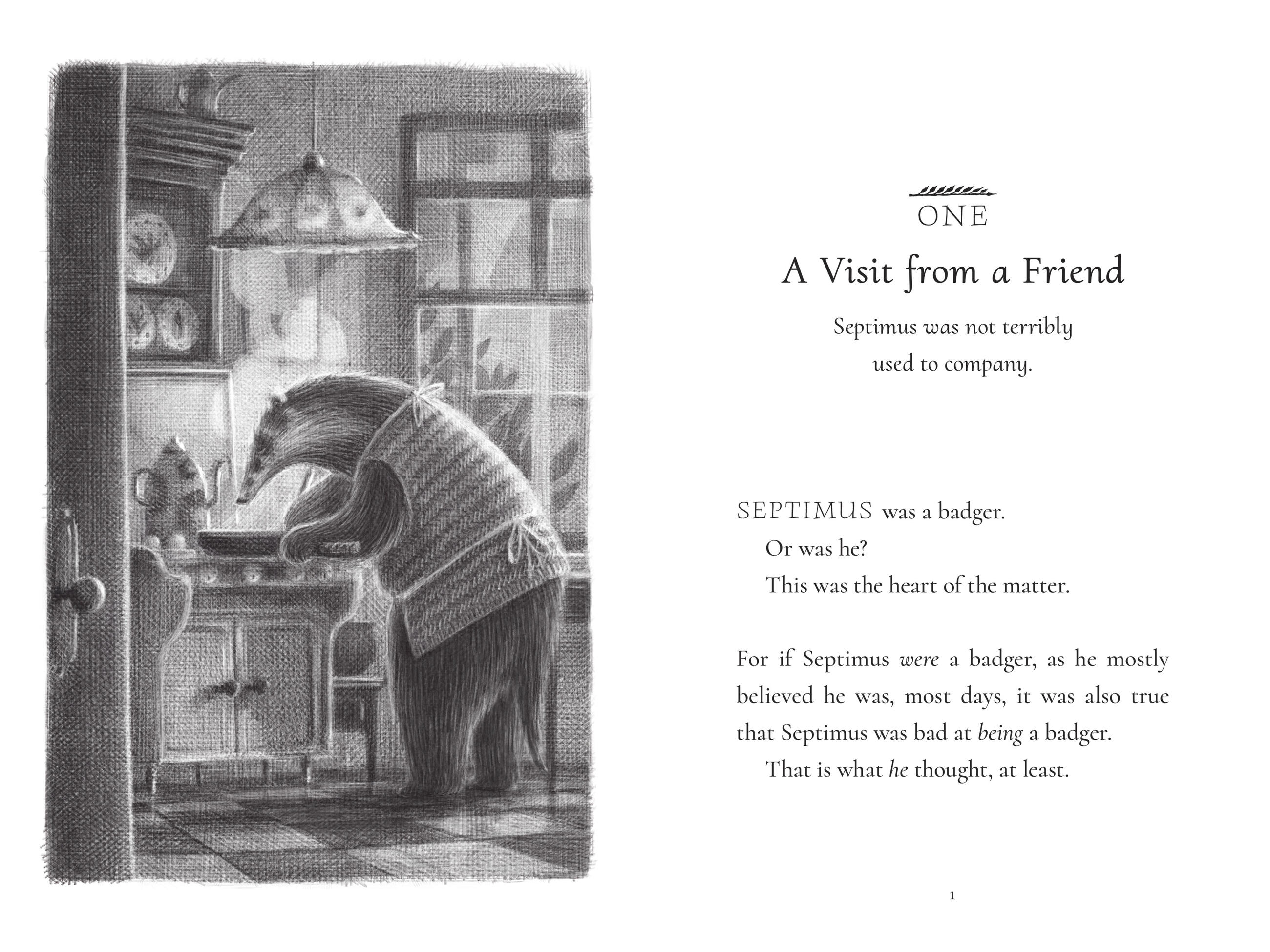 When a gull of very few words lands on the windowsill, Septimus leaps at the possibility of friendship. However, his new confidant soon goes missing and Septimus is bereft. Determined to find his best—and only—friend, he ventures into new territory and encounters a cast of surprising characters. Can Septimus be as brave and bighearted as he’ll need to be to find Gully? Or is he really a bad badger after all?
