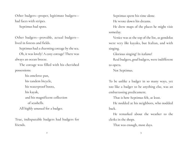 Septimus is not good at being a badger. He adores the sunset. He dreams of going to Venice. And he lives alone in a charming cottage by the sea. He’s not unhappy with his tidy, solitary life, but there are times when being so bad at badgerdom makes him wonder if he’s even a badger at all.