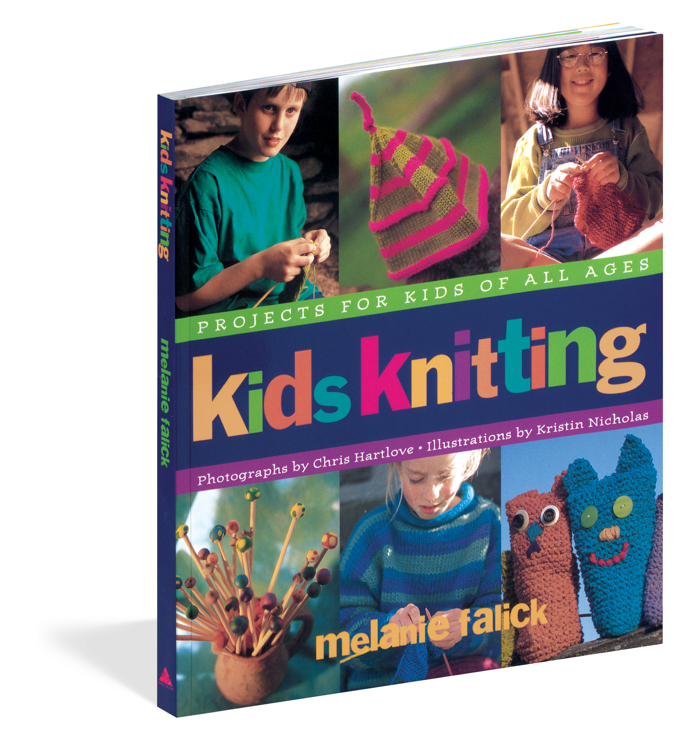 Kids Knitting emphasizes fun in every step of the learning process. Sunny paintings by Kristin Nicholas illustrate the individual steps of each technique. Bright boxes of blues, greens, and reds explain everything from button-sewing to tassel-tying. Charming photographs by Chris Hartlove feature finished projects modeled by the creators themselves–all kids who knit.