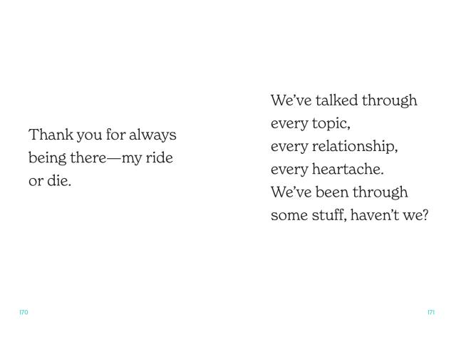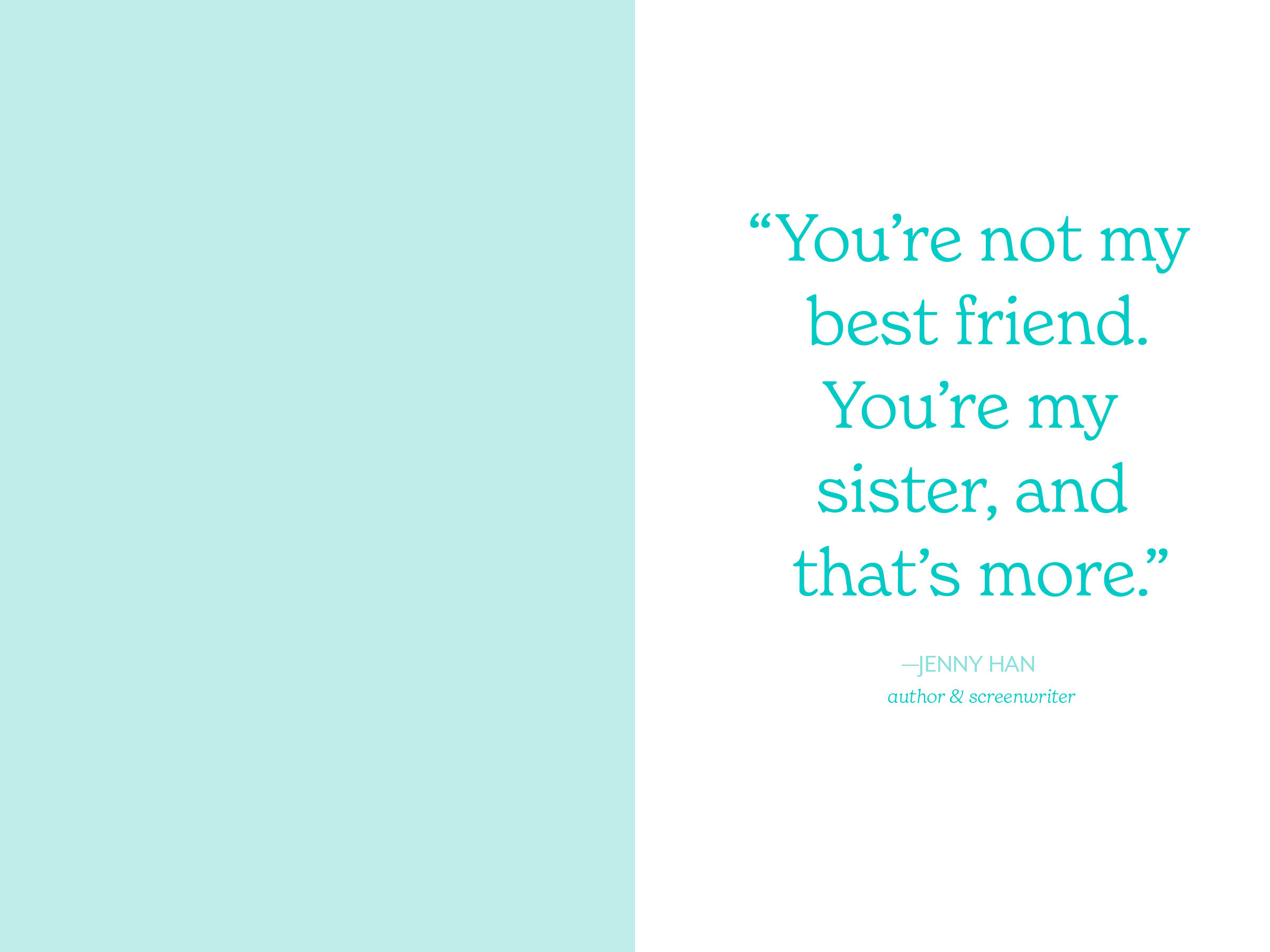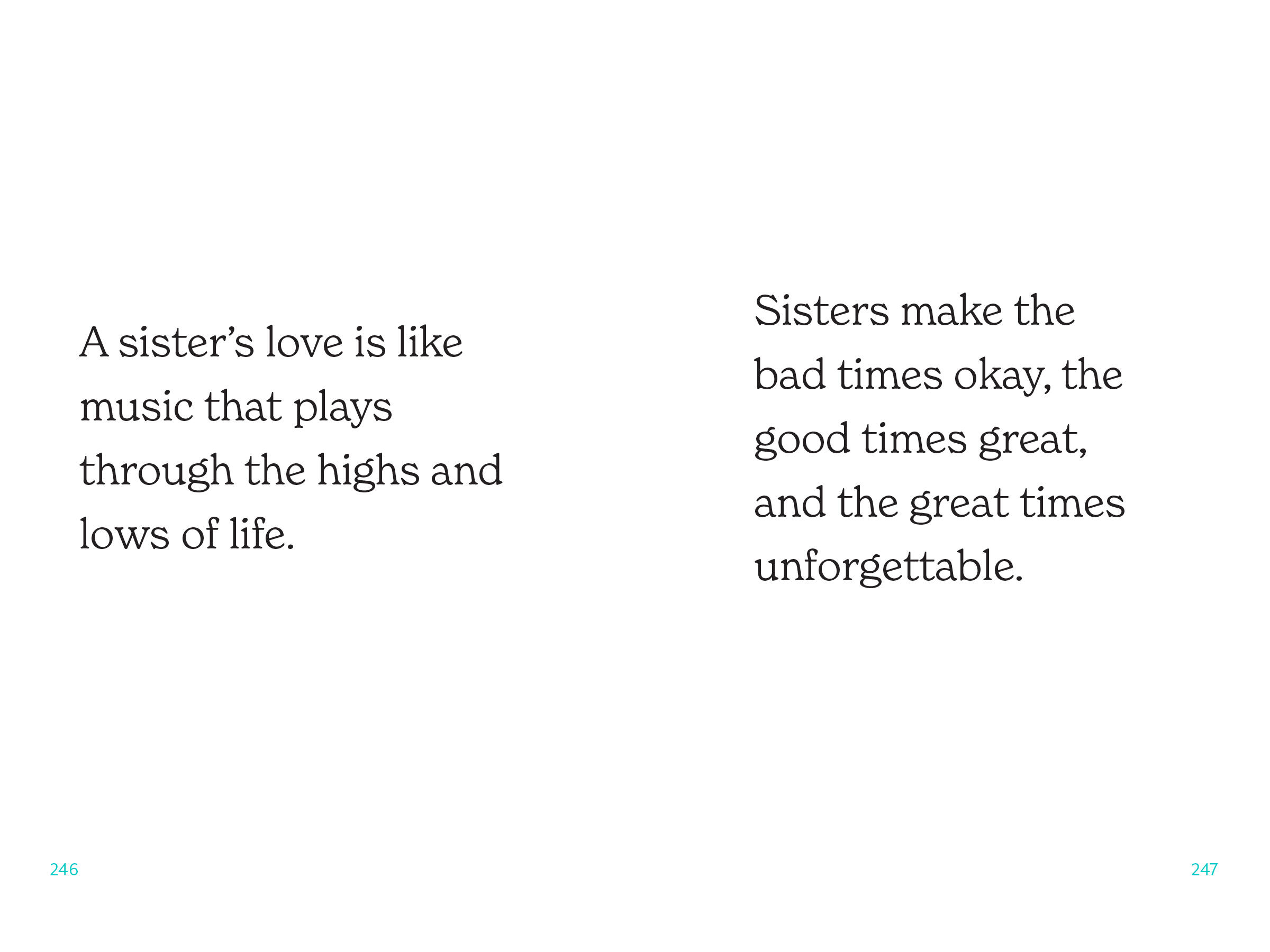 Sisterhood is a bond unlike any other—a sister is a built-in best friend, a sworn secret keeper, a second memory bank, a reflection of yourself. Sister to Sister is a celebration of this unbreakable relationship, with musings on all the ups, downs, and humor that come with a life lived side by side. The reflections will make you laugh, cry, smile, and want to call your sister to share them.