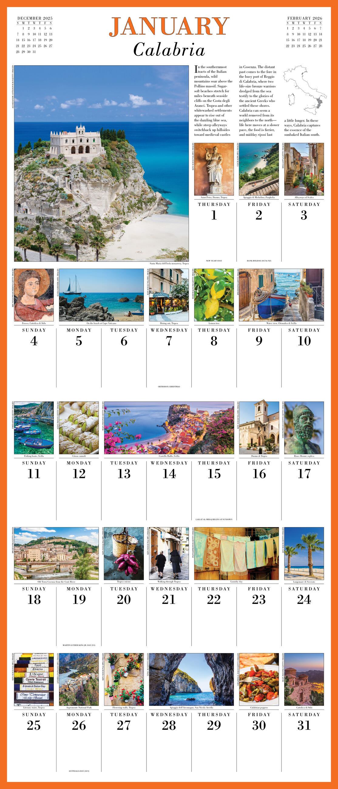 - BUCKET LIST DESTINATIONS: Experience Italy’s most beautiful sights, including Calabria, Rome, Riviera di Ponente, Lombardy, Taormina, and more in stunning full-color photos throughout the monthly grid.