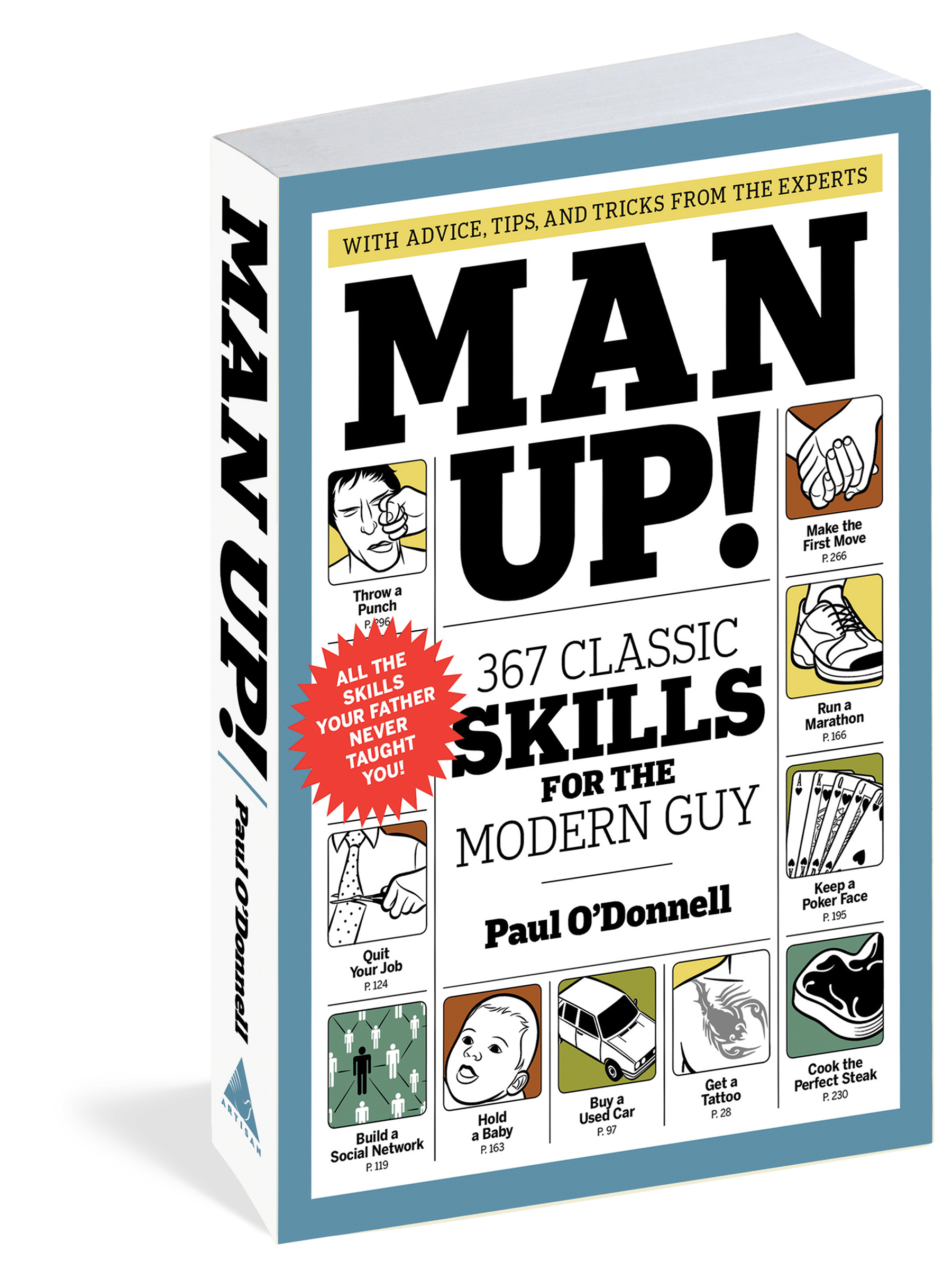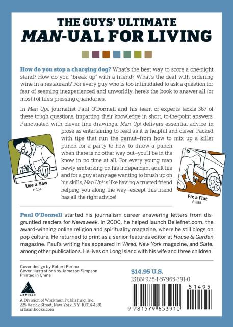 In Man Up!, journalist Paul O’Donnell and his team of knowledgable experts tackle 367 of these tough questions, imparting their advice in short to-the-point answers. Organized thematically, Man Up! is packed with essential advice delivered in prose that is as entertaining to read as it is helpful and clever. The tips run the gamut—from how to mix up a killer punch for a party to how to throw a punch when there is no other way out. Hip, engaging line drawings help to illustrate the advice, providing more than just sight gags. For every young man newly embarking on his independent adult life and for a guy at any age wanting to brush up on his skills, Man Up! is like having a trusted friend helping you along the way—except this friend has all the right answers!