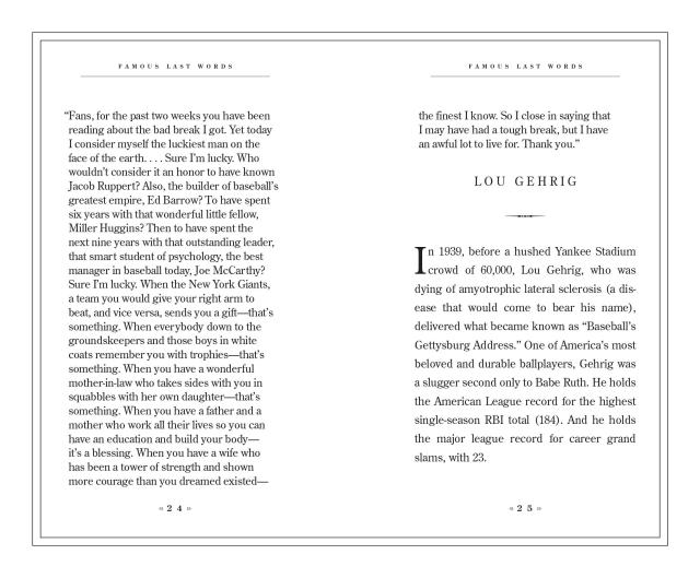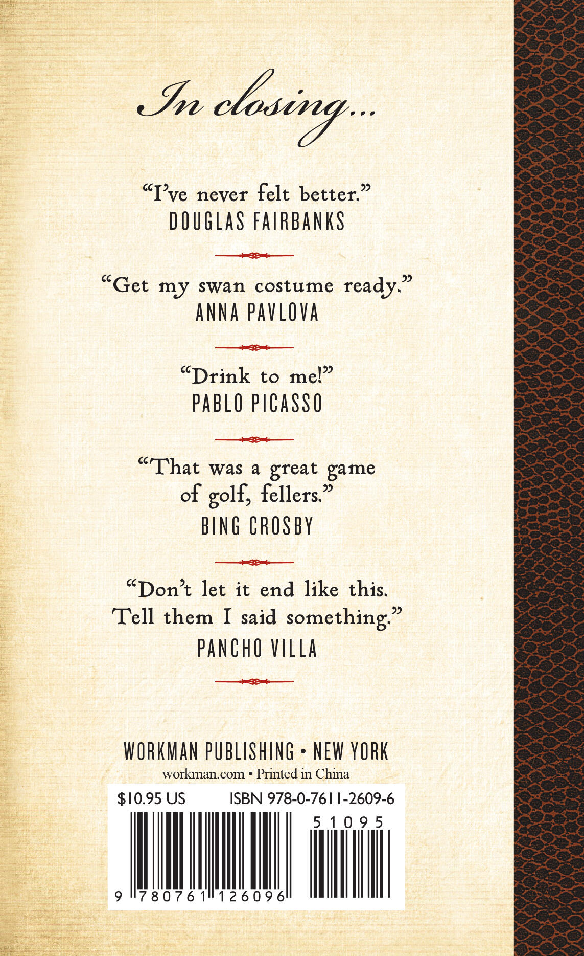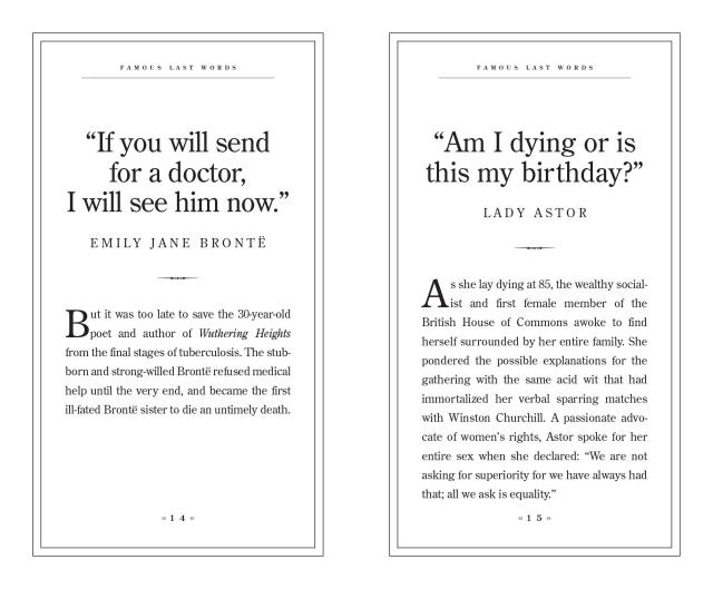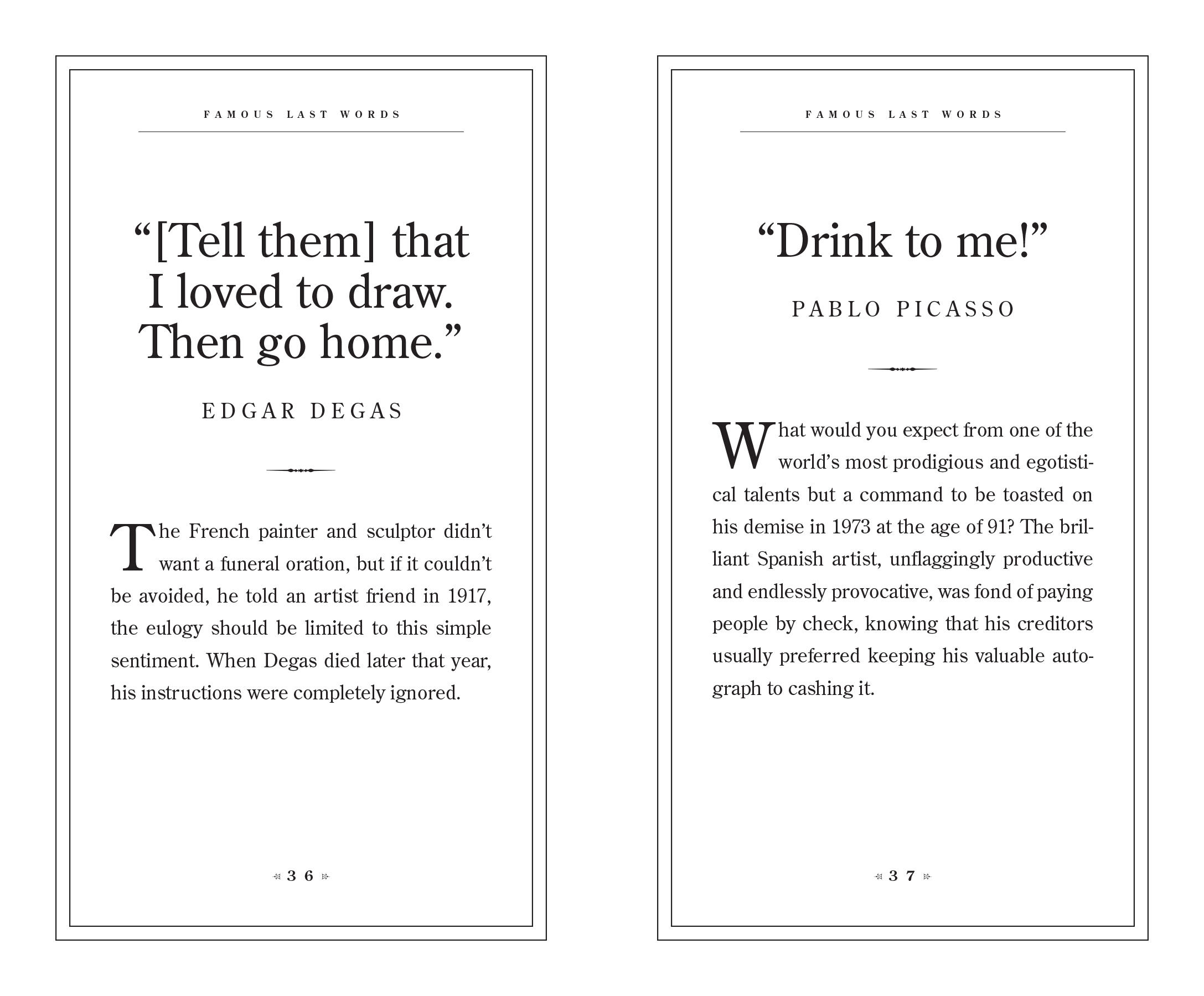 Ultimately, every one of these parting statements is a reflection of the person behind it. Each is accompanied by a mini-biography of the speaker, including the context of death, from the golf course (“That was a great game of golf, fellers.”—Bing Crosby) to a favorite armchair (“Go on, get out. Last words are for fools who haven’t said enough.”—Karl Marx).
