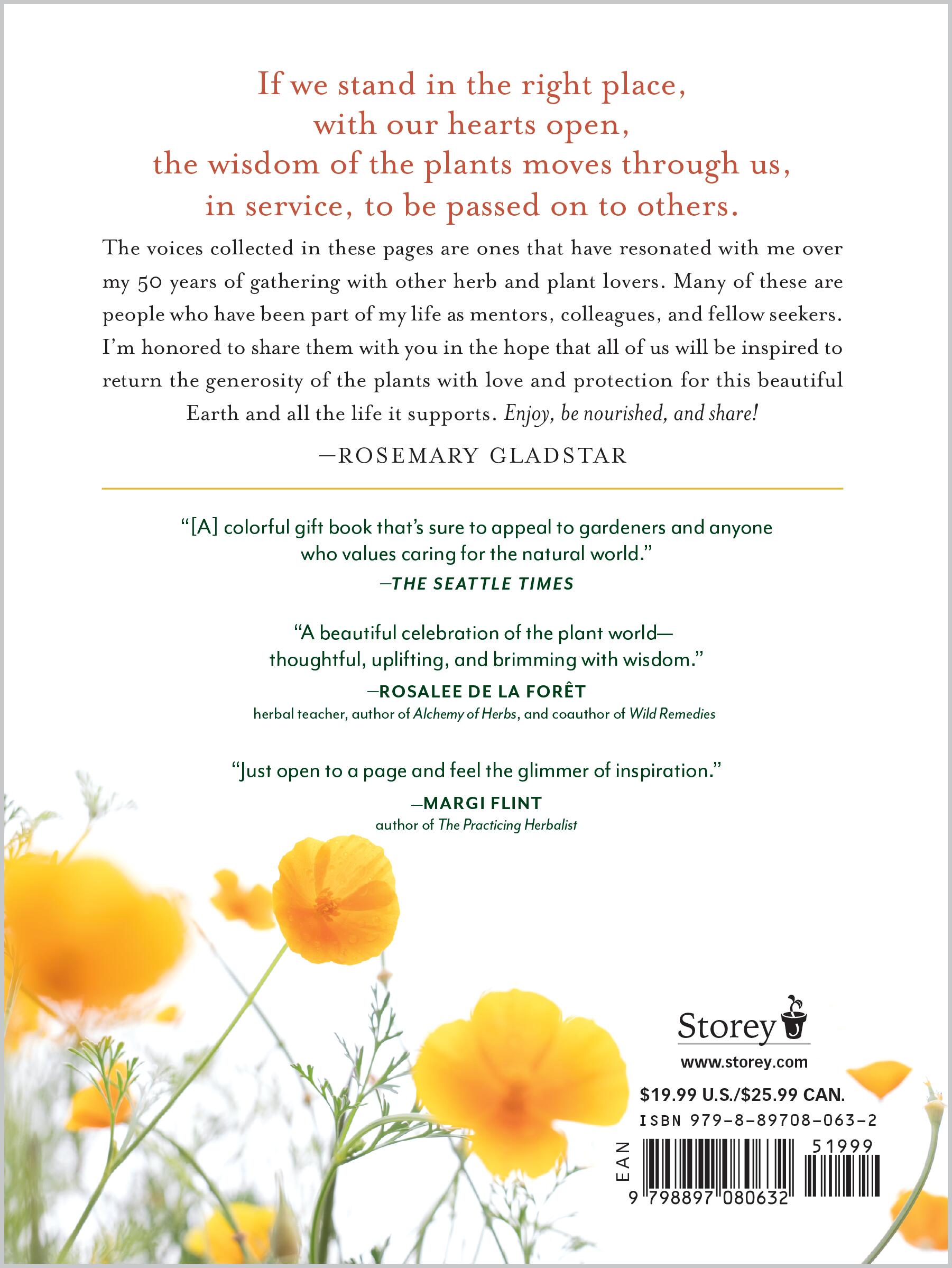 A beloved teacher and leader in the herbal healing world for more than 50 years, Rosemary Gladstar has curated this collection of her favorite teachings and reflections from a wide range of plant lovers and herbal teachers. The many featured voices explore key themes in herbalism, including: the sacred teachings of the plants; the importance of preserving knowledge of the plants’ healing properties and the work of herbal healers; the practices of gardening and gathering herbs in the wild; the power and passion of the herbal community; and the rich value of living with reverence for the Earth and a deep connection to the plant world. Many of the quotes are original to this collection, excerpted from Gladstar’s private correspondence and conversations. Her narrative voice runs through the book, introducing each theme, and the text is accompanied by stunning photographs and artwork celebrating the beauty and wonder of plants.