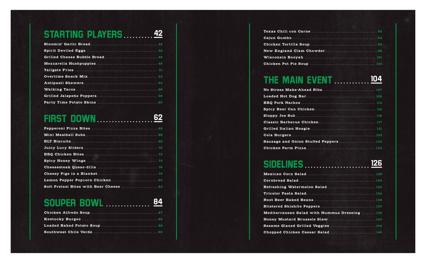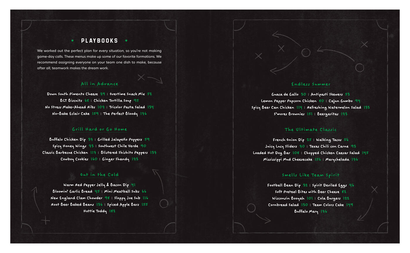 Clear eyes, full bellies, can’t lose. This handy guide is everything you’ve ever needed to turn a tailgate into a tail-great. We’ll guide you through all the equipment you need to score big. We’ll huddle up for important lessons like packing a cooler and working the grill. We’ll hand over the playbook for 75 recipes that are guaranteed to make you the MVP of every tailgate. And we’ll even coach from the sidelines with hints, tricks, and tips to make every dish a touchdown. You’ll find dips, apps, soups (it gets cold out there!), salads (you need something green on your plate), rib-sticking mains, desserts ranging from no-bake to show-off, and a variety of mixed drinks including beer, cocktails, Bloody Marys, and plenty of rounds of shots in-between. The food is all over the map here, literally. We’ve got the South (Down South Pimento Cheese), the North (New England Clam Chowder), the Midwest (Wisconsin Booyah), the Southwest (Southwest Chili Verde), and the West Coast (Guaca de Gallo). Tailgating is not about who wins or loses. It’s about loading your plate with good eats, spending quality time together, and making memories that last.