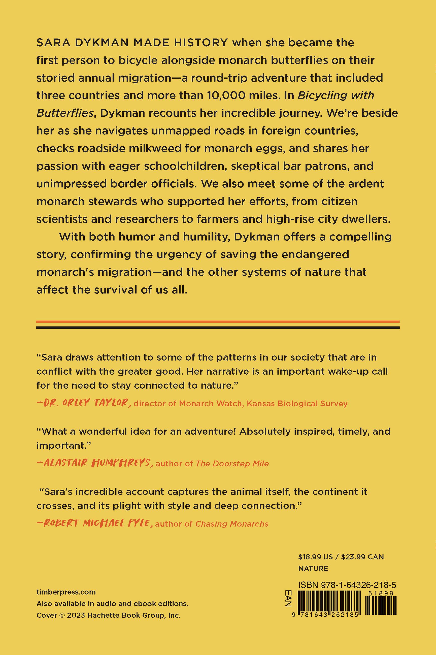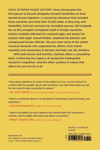 "On this improbably adventure, Sara Dykman followed the extraordinary monarch migration by bicycle, and came back to write about it. She has recorded it well. Her almost incredible account captures the animal itself, the continent it crosses, and its plight with style and deep connection." —Robert Michael Pyle, author of Chasing Monarchs and founder of the Xerces Society for Invertebrate Conservation