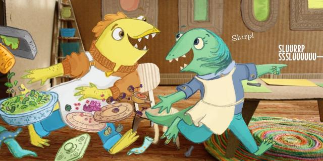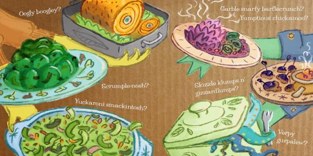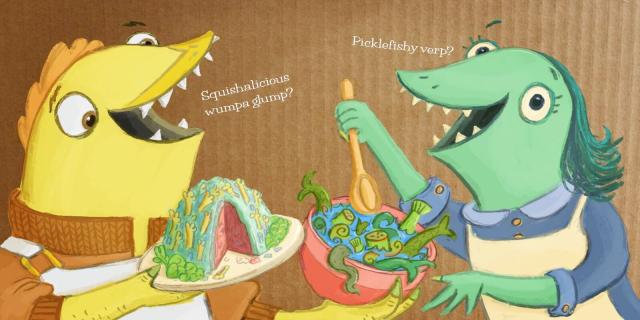 What’s for dinner? How about skizzle klumps n’ gizzardlumps? A hilarious look at mealtime with a pair of persnickety eaters, in the most fun made-up language ever!