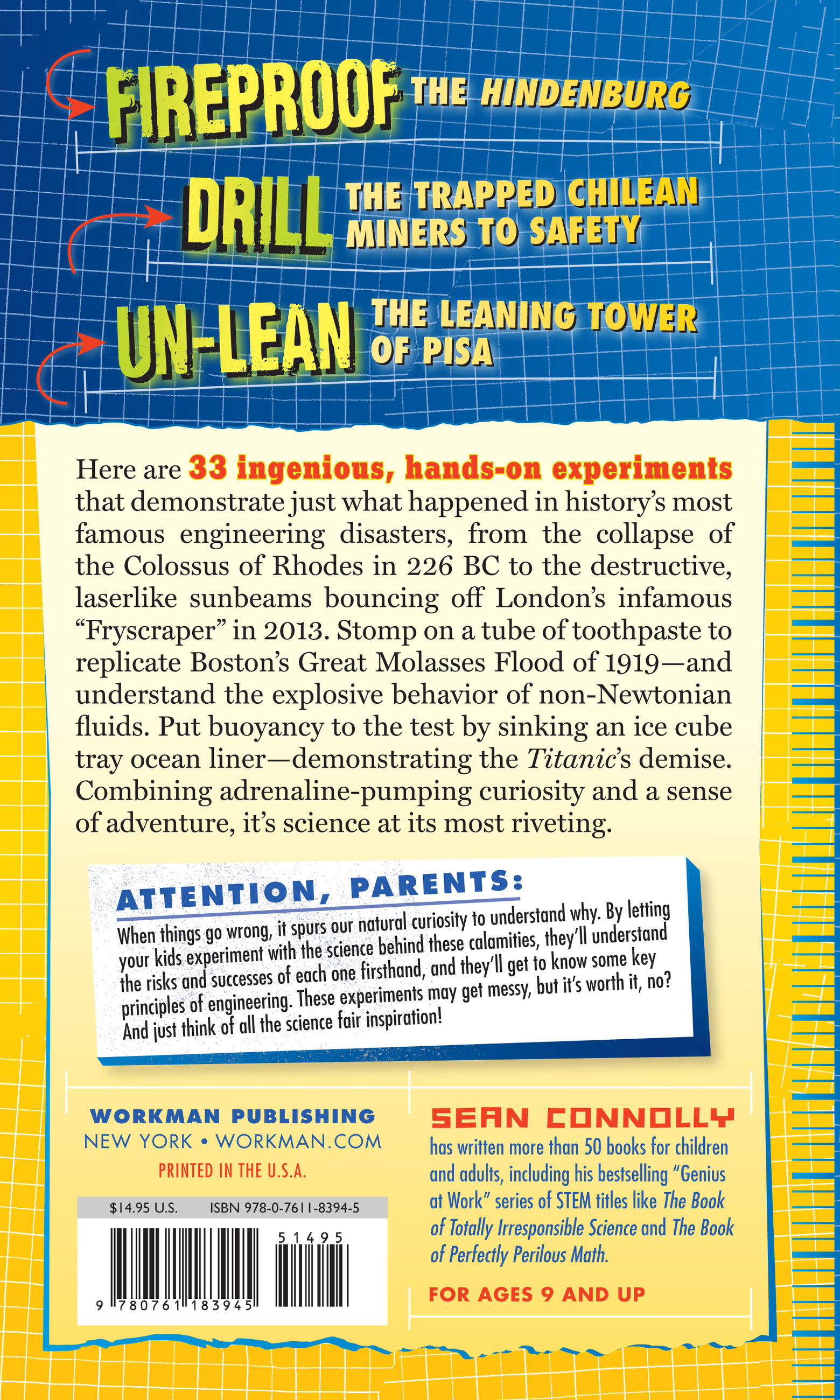 Each engineering disaster includes a simple, exciting experiment or two using everyday household items to explain the underlying science and put learning into action. Understand the Titanic’s demise by sinking an ice-cube-tray ocean liner in the bathtub. Stomp on a tube of toothpaste to demonstrate what happens to non-Newtonian fluids under pressure—and how a ruptured tank sent a tsunami of molasses through the streets of Boston in 1919.