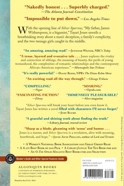 “A tense, layered and evocative tale . . . Jones explores the rivalry and connection of siblings, the meaning of beauty, the perils of young womanhood, the complexities of romantic relationships and the contemporary African-American experience.”O: The Oprah Magazine “Charting a vast emotional unknown is Tayari Jones’s compelling third novel, Silver Sparrow, in which a teenage girl’s coming of age in 1980s Atlanta is shadowed by her dawning understanding of a corrosive secret — her father’s second family.”—Vogue “Silver Sparrow will break your heart before you even know it. Tayari Jones has written a novel filled with characters I’ll never forget. This is a book I’ll read more than once.”—Judy Blume “The most immersive novel I read in 2011 . . . It’s one of those ‘just one more chapter’ kinds of books that require much last-minute changing of plans, because real life feels far less amusing, appalling, shocking, and loving than the world of its characters.”—Slate “An exciting read all the way through.”—Chicago Tribune “It’s really powerful.”—Diane Rehm, The Diane Rehm Show “Tayari Jones has taken Atlanta for her literary terroir, and like many of our finest novelists, she gives readers a sense of place in a deeply observed way. But more than that, Jones has created in her main characters tour guides of that region: honest, hurt, observant and compelling young women whose voices cannot be ignored . . . Impossible to put down until you find out how these sisters will discover their own versions of family.”—Los Angeles Times “That Jones offers no pat answers is the secret sauce spicing Silver Sparrow. The prose goes down so compulsively that it might be easy to miss the heart of the story. She shines a light on a particular disenfranchised group, the children who grow up in second families.”—The Denver Post “Populating this absorbing novel is a vivid cast of characters, each with his own story . . . Jones writes dialogue that is realistic and sparkling, with an intuitive sense of how much to reveal and when.”—The Washington Post “Award winner Tayari Jones weaves a tale of Black bigamy and two families in the fascinating fiction of Silver Sparrow.”—Ebony “Sharp as a blade, gleaming with ‘sense’ and humor. Her themes of legitimacy and secrets play out with symphonic, seemingly effortless resonance, and her indelible characters—one daughter a secret, discovered by the other—redefine love, loyalty, and betrayal in a New South only generations removed from slavery’s fracture. Jones is a master, and Silver Sparrow is a revelation, alive with meaning, heartbreak, and hope.”—Jayne Anne Phillips, author of Lark and Termite “Tayari Jones’s immensely pleasurable new novel pulls off a minor miracle . . . Subtly exploring the power of labels, Jones crafts an affecting tale about things, big and small, that we forfeit to forge a family. There are no winners in this empathetic and provocative story, only survivors.”—More “If your mom is a fan of emotionally charged morality tales (and whose mom isn’t?), she’s going to devour Tayari Jones’s third novel, Silver Sparrow, in a single sitting. Jones, a native Atlantan, once again mines her town for material and strikes serious pay dirt.”—Essence “Silver Sparrow grabs you with a first sentence that manages to be both matter of fact and mysterious and refuses to release you until she has finished a story that takes you deep into the lives of a family that is anything but ordinary. Graceful writing and careful attention to details have always been on display in Jones’s writing, but with this novel, she has found her own dazzlingly original voice, and in her hands, a sparrow suddenly becomes a soaring songbird.”—Pearl Cleage, author of Till You Hear from Me “Jones’ women . . . are all drawn well, from the sisters and their mothers to minor characters . . . Jones gives us permission to love all of [her novel’s] women, though they are flawed and often refuse to love each other. That’s a recipe for great book club discussions, and I wouldn’t be surprised to see Silver Sparrow featured in many.”—Milwaukee Journal Sentinel “This is a heartbreaking story of two sisters, unknown to each other at first, who find and love each other for a short time in their lives.”—The Oklahoman “Set in the 1980s with deft, understated detail, Silver Sparrow is a thoughtful story about bigamy, but it is also a lovely, realistic portrait of two teenage African-American girls, and an exploration of the bonds between mothers and daughters.”—Chapter 16 “Through Jones’ spellbinding storytelling, the reader is pulled into the drama until the very last, heartwrenching page. Watch for this amazing book to be among the best of the year.”—Wichita Falls (TX) Times Record News “Jones—author of the acclaimed Leaving Atlanta and The Untelling—remains faithful to her characters. Both girls are fully developed and complex. The book is aptly titled; if God’s eye is on the sparrow, one can imagine the struggle each girl feels to believe that someone watches after her.”—The Virginian-Pilot “An old-fashioned page-turner that explores class and gender concerns, friendship, and the profound effect that parents have on their children and that loyalty has on love.”—Pasatiempo “A beautifully written literary feat.”—Durango Herald “If this book spoke aloud it would speak with a quiet, unsteady voice, one on the edge of tears . . . It’s like its narrators, sisters Dana and Chaurisse, each of whom sees herself as ordinary, not due much notice. Each envies those they call ‘Silver’—the shiny, beautiful, wanted people. Each views her world with a quiet, honest eye.”—Paste magazine “Silver Sparrow is rich, substantive, meaningful. It is also, at turns, funny and sharp, haunting and heartbreaking.”—The Root “The strength of 